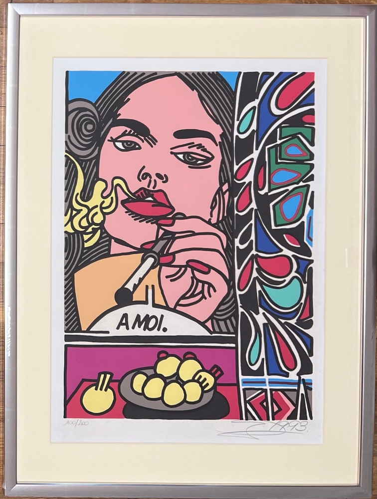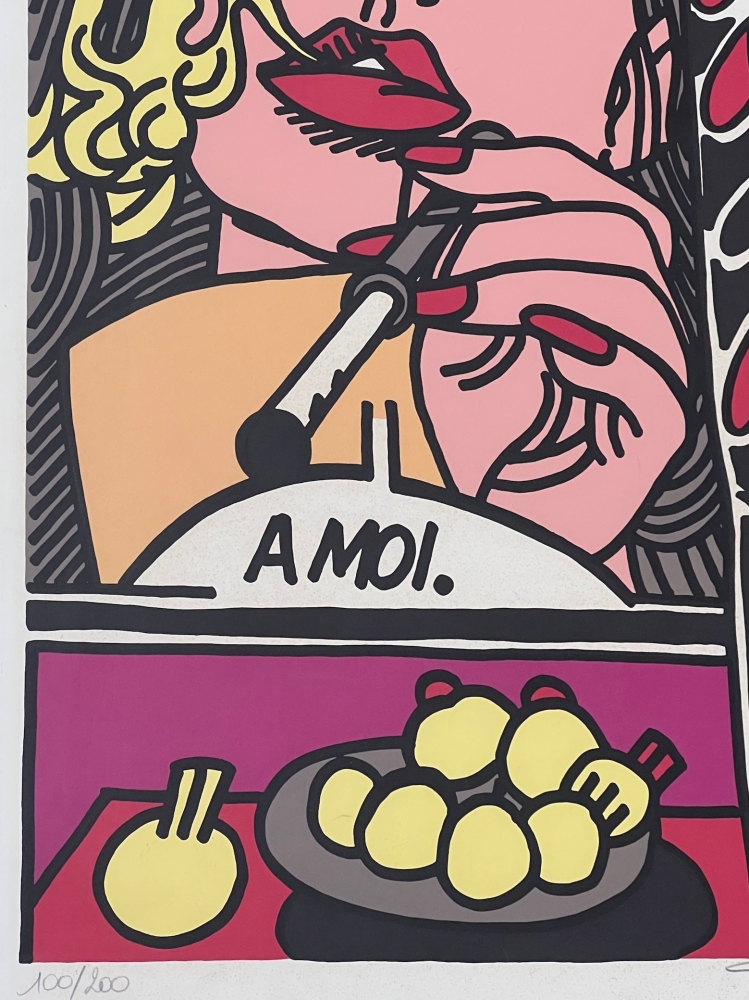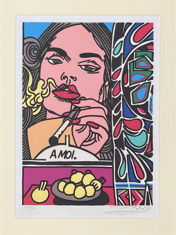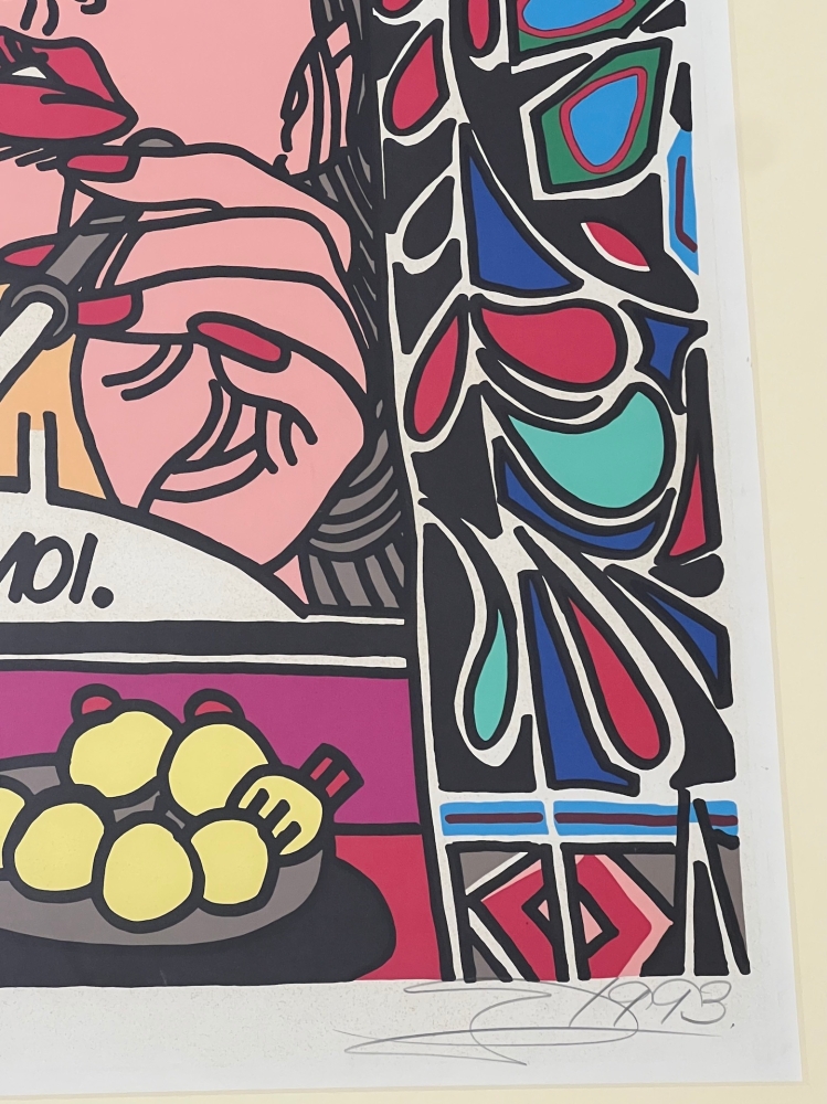 Lithograph signed and dated in graphite at bottom. 100/200 Provenance stamp on the back: Atelier Guillaume Corneille A comic strip artist who died too soon in a car accident, Bonvi's print here is close to New Figuration and Pop Art, reminiscent of Erro, Roy Lichtenstein and Keith Haring for its impertinence. Period frame with scratches, especially on the side edges, but the work is in very good condition. Dimensions with frame : 80 x 59,50 cm Size of work : 62 x 44 cm Interesting composition with the still life in front and a curtain inspired by ethnic designs, reminiscent of the contrasting colours in Matisse's oriental images. Franco Bonvicini, known by his pseudonym Bonvi, was born on 31 March 1941 in Modena, Italy, and died on 10 December 1995 in Bologna. He was an Italian cartoonist who entered the world of contemporary art with a number of prints. In particular, Bonvi is the author of the comics Sturmtruppen (a successful anti-militarist comic), Nick Carter and Milo Marat.