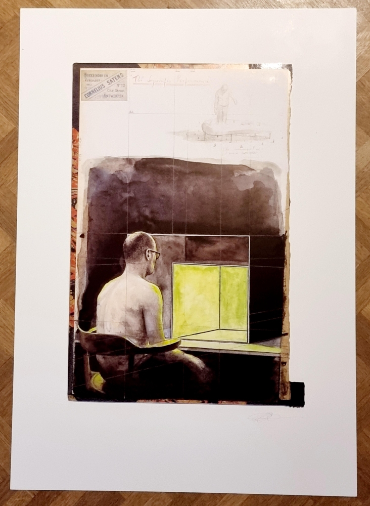 Very nice work with mixed technique (offset + collage) by rising star GIDEON KIEFER. Hand signed on the front by the artist and numbered on the back. Attention! This is one of the numbered copies! An uncanny world, filled with dreams, memories and how to deal with the unreliability of his own memory, form the common thread through the oeuvre of Gideon Kiefer (°1970, lives and works in Ghent). This personal research is more than once mixed with subtle social criticism in which ecological, socio-economic or political issues are not shunned.