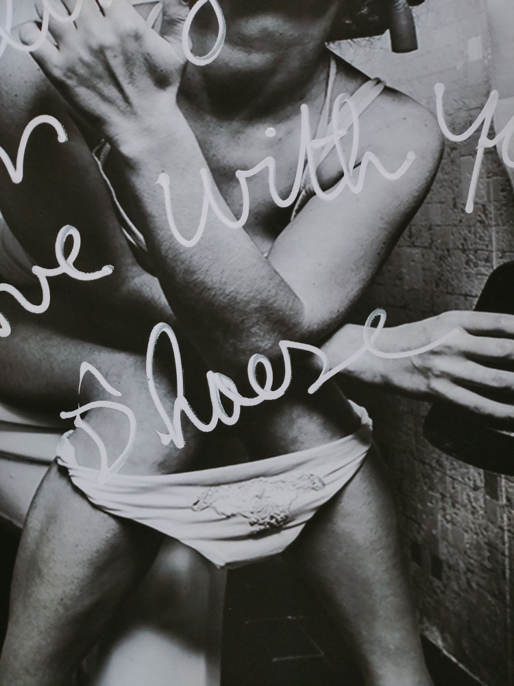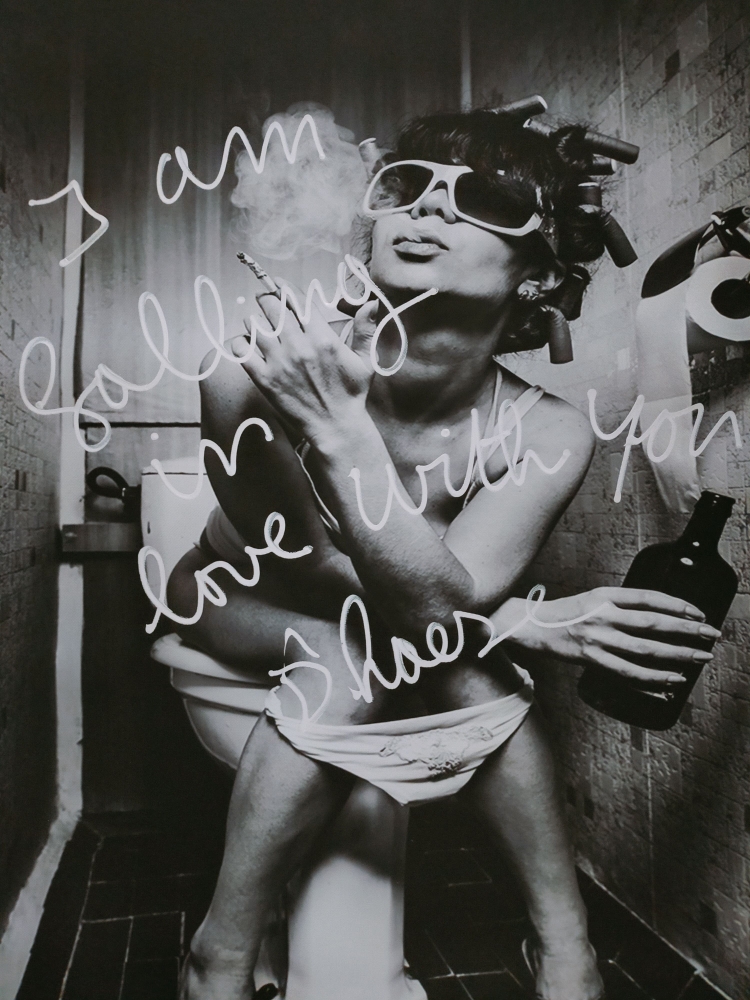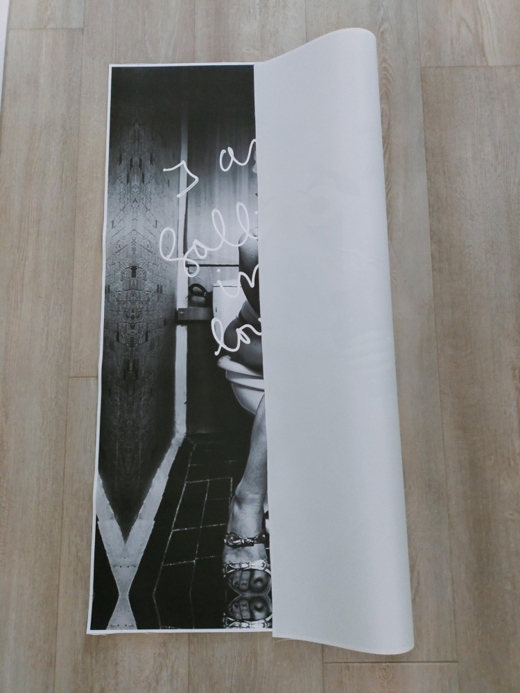 Hannes D'Haese - Woman on toilet (I Am falling in love with you) Print op doek Niet ingelijst Handgeschreven tekst + handgesigneerd Perfecte staat Elke print heeft een andere tekst dus een uniek exemplaar.