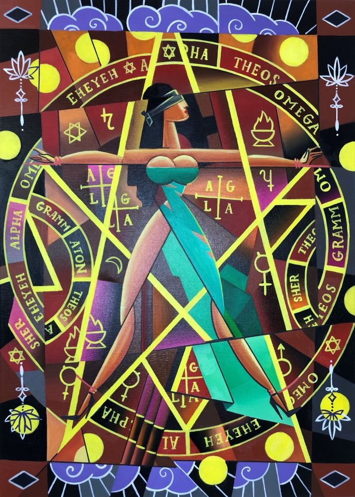 WOW! a Secret Cubism 00223 Behind the Scenes of the Occult. Contemporary painting from Czech artist Apollonas Soben. Oil on canvas 70x50 Yeah! I have been fond of esoteric sciences for a long time, tried various practices, read books and watch programs. I believe that everything around us uses symbolism, and the world is ruled not by people, but by symbols. All world history, including the history of art, refers us to secret societies, symbols and signs, as well as various forms of mysticism and esotericism. I thought for a long time how to display the theme in my style of romantic cubism, and came to the conclusion that the best option is through some kind of ritual, with a lot of symbolism. Of course, Apollonas Soben did not mean any specific society or action, everything that is depicted in oil on canvas is presented in a collective way, and the result in the picture does not imply any appeals or advertising. The image is collective and does not reflect anything concrete! - Oil on canvas - Painted from sides (Gallery style) - Don`t need decoration frame - Ready to hang - Security elements - Original can be checked at official web - Certificate Delivered by Bulgarian Post or DPD packed in box, ready for hanging - Author from 2021, a member of the Association of Artists of CZ. - 2023 Artist Value Certificate Montpellier, France. - Cooperation with private film producers. Exhibitions in Europe. - The motives of the paintings was the scenery of the albums of the singer from the USA.