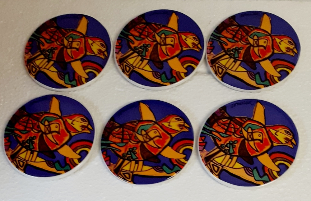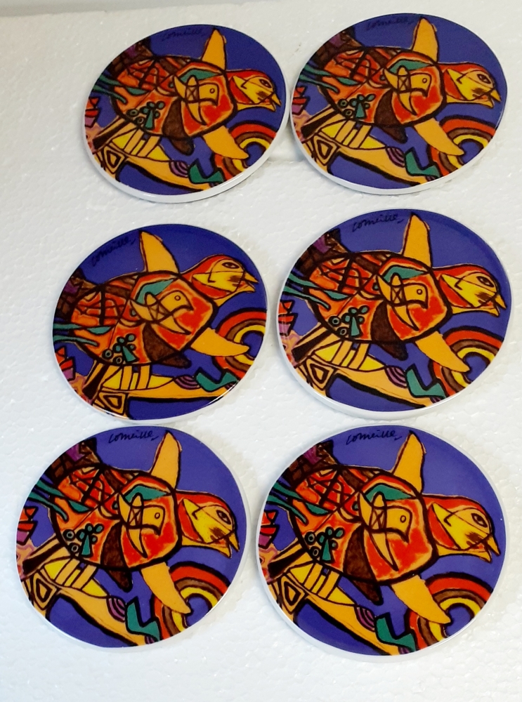 Special Editions Corneille (1922-2010) Set of six ceramic Corneille Coasters They are very colorful Moreover, the bottom has a protective layer of rubber Diameter: 10.5 cm In good condition Signed: Corneille.