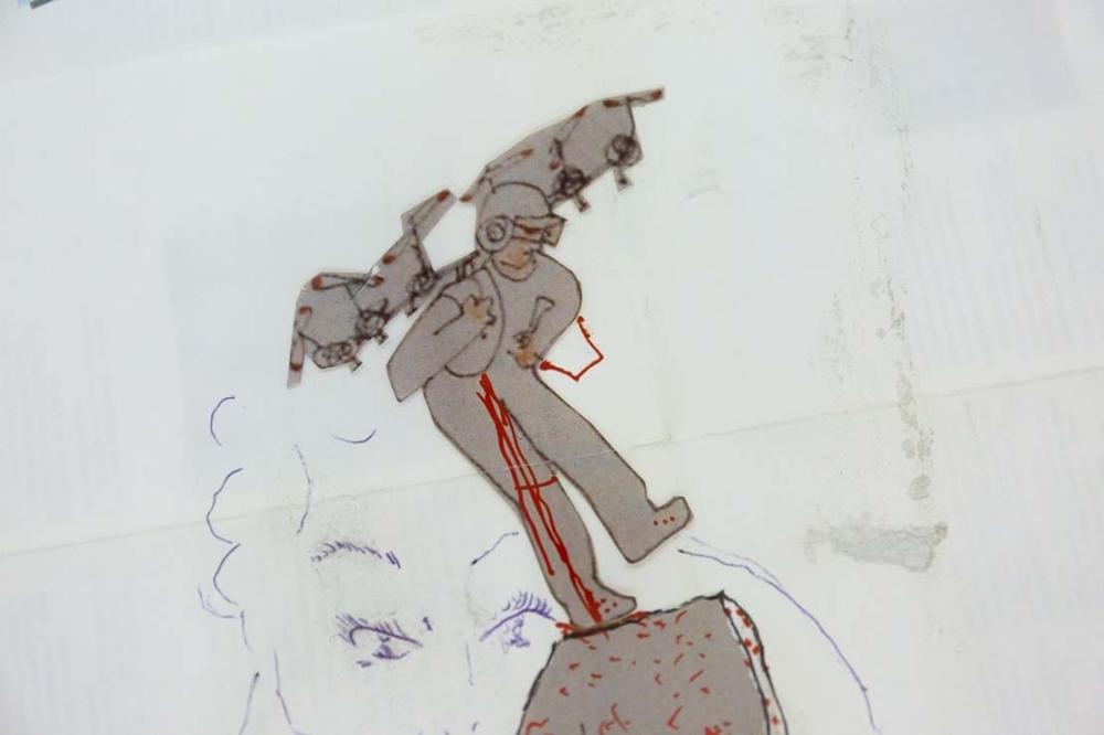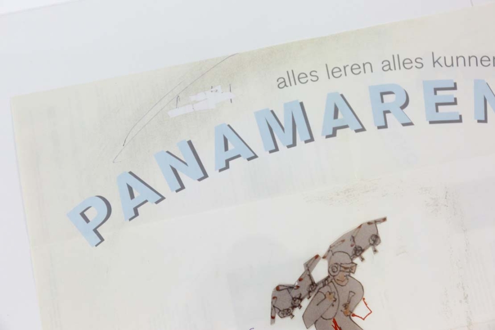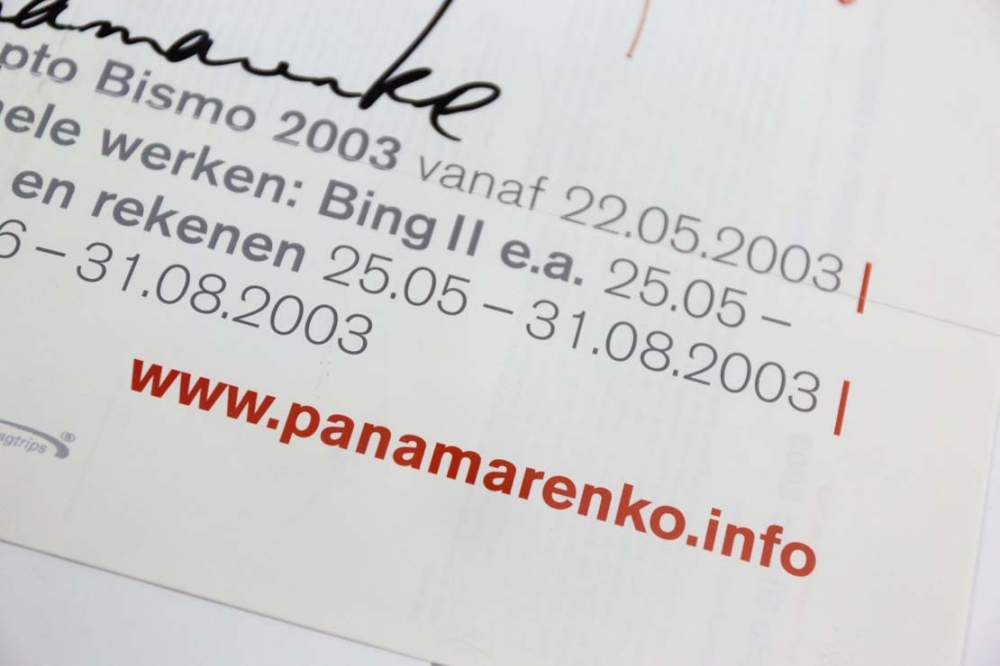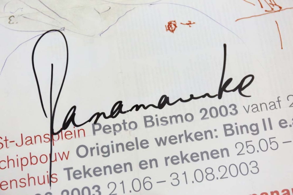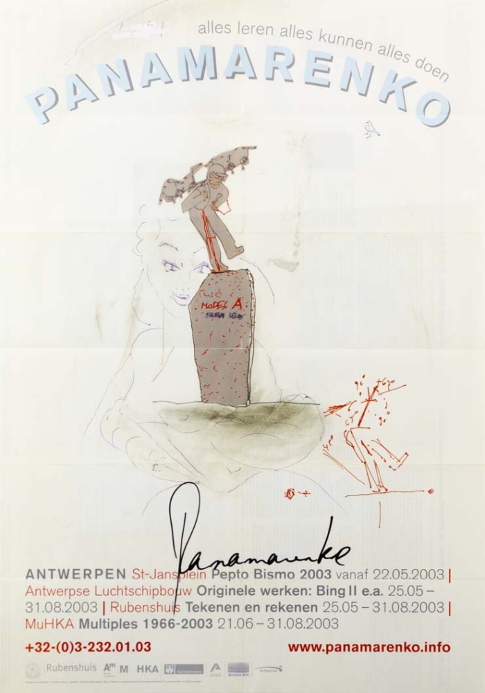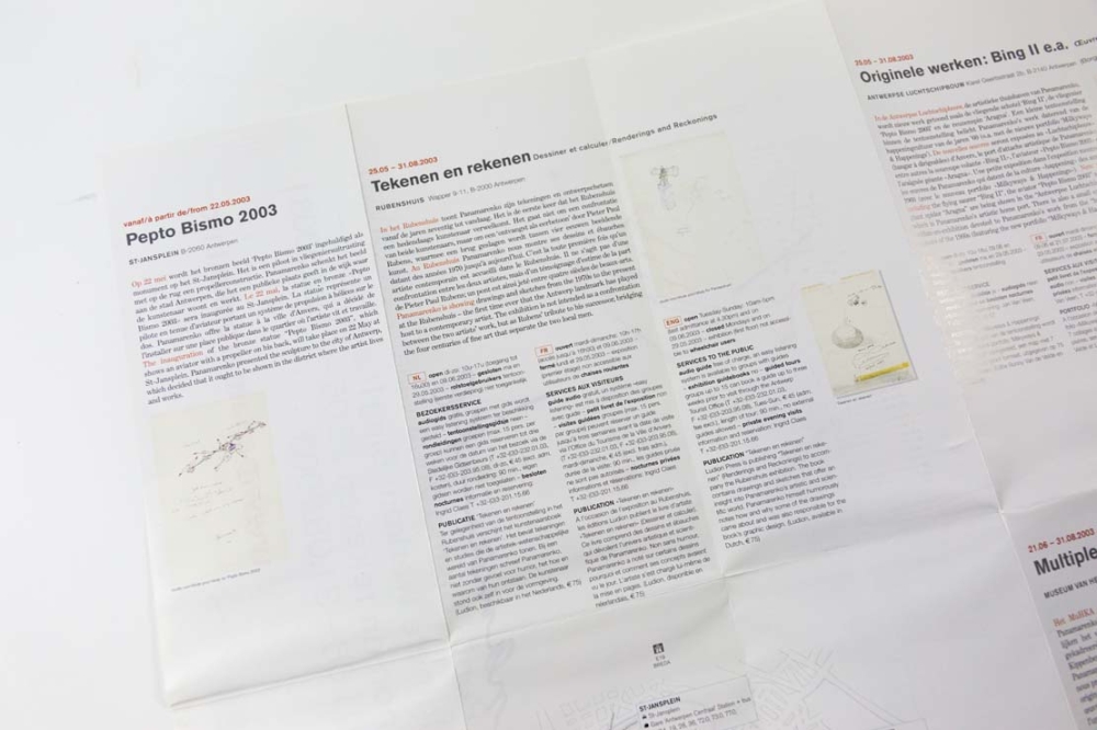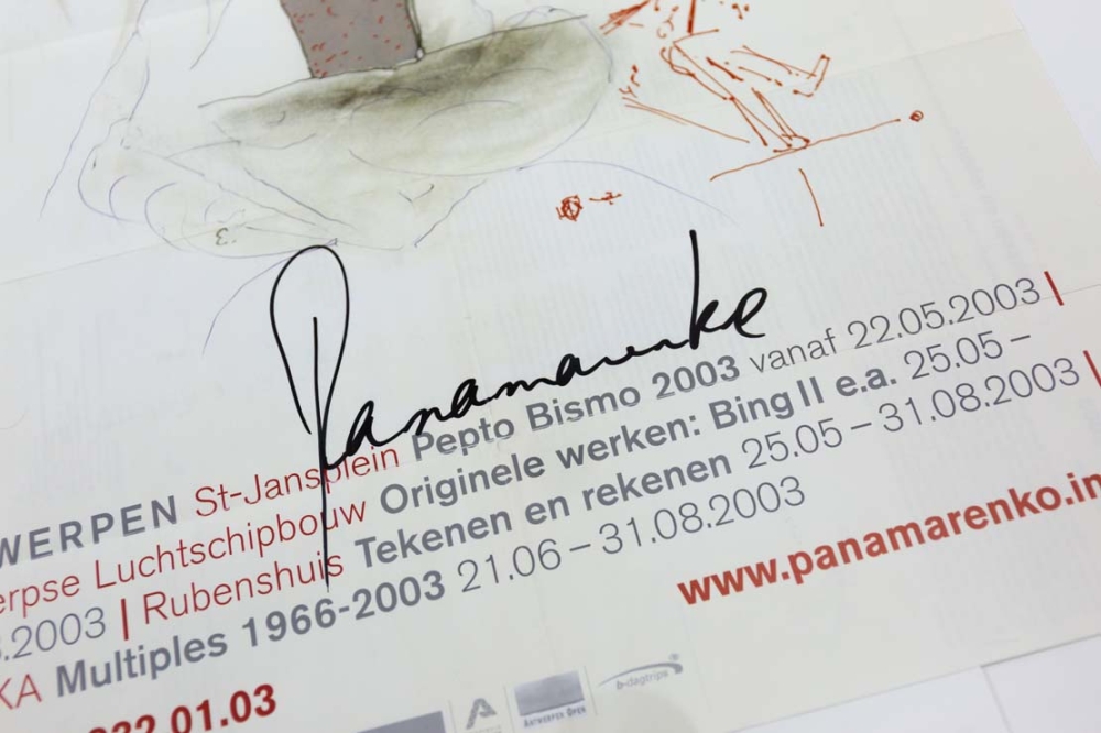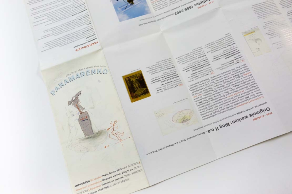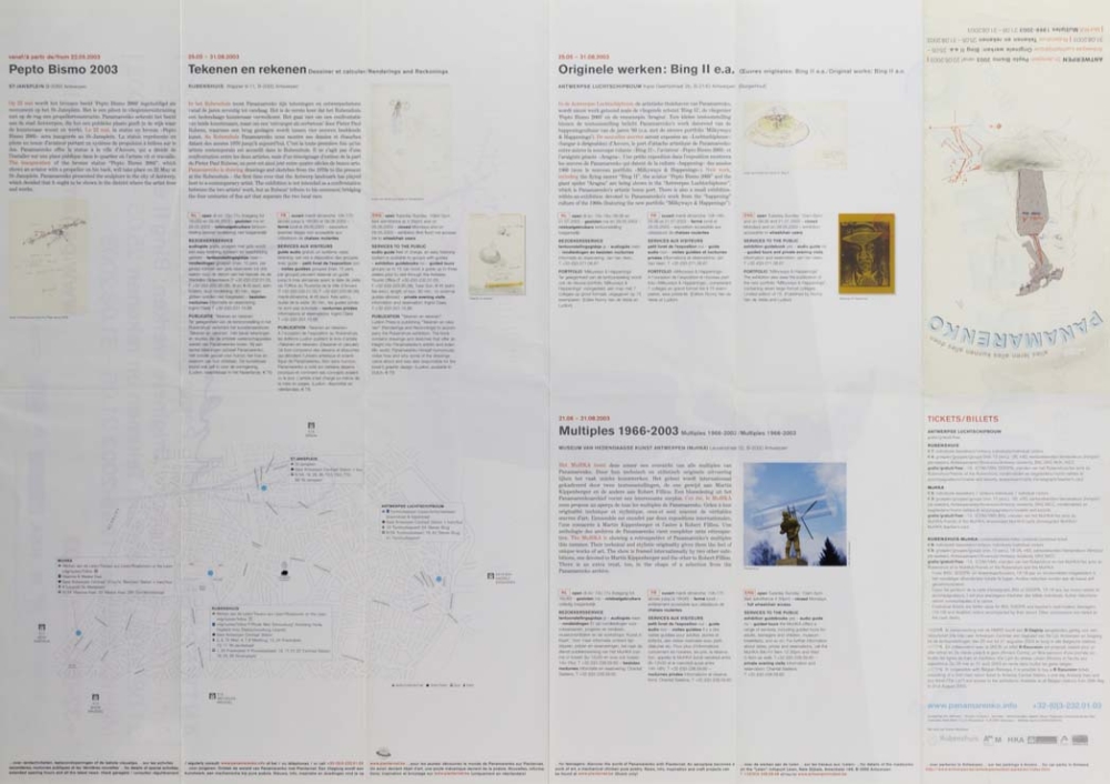 Een plooifolder/affiche voor enkele exposities van Panamarenko in het Antwerpse in het jaar 2003. Affiche is met de hand in stift gesigneerd door Panamarenko. Op de voorkant staat een tekening van Pepto Bismo afgebeeld.