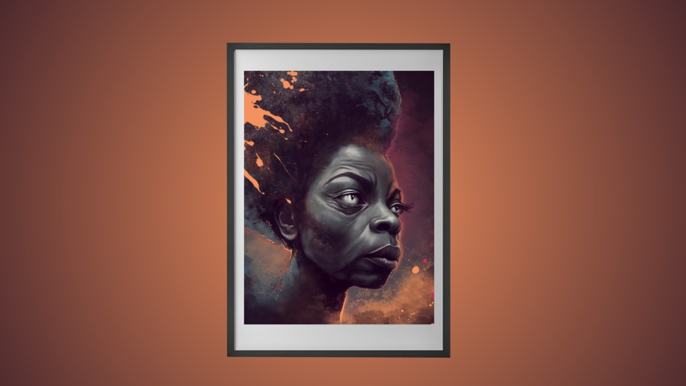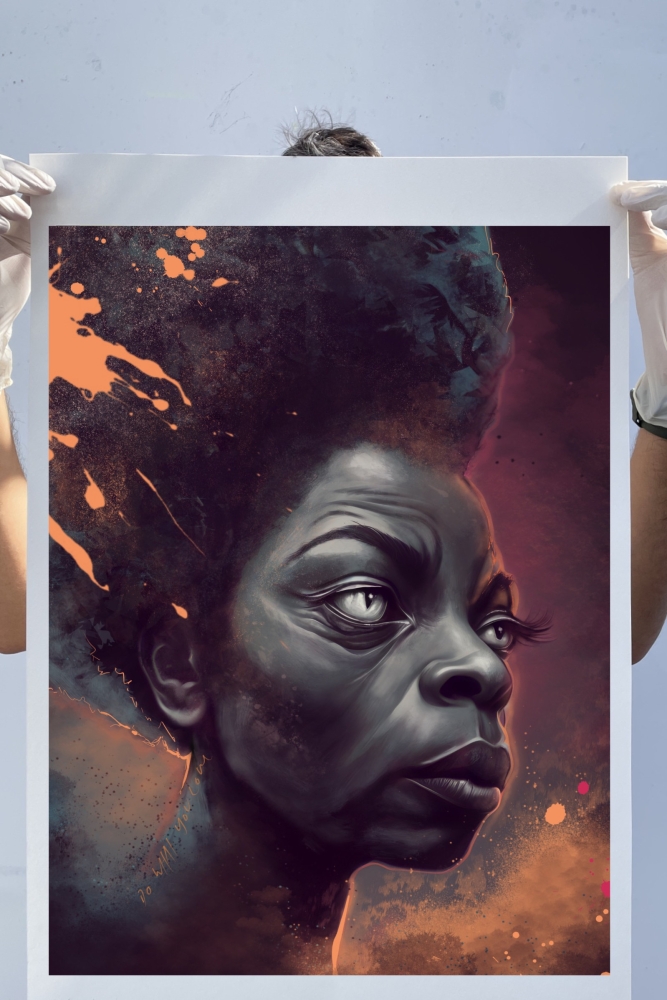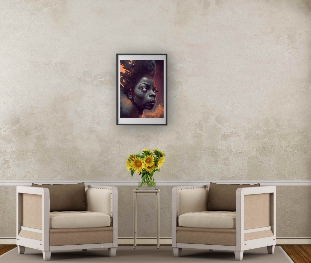 "Simone's Timeless Resonance" Presenting a remarkable rendition of Oliver's artwork: "Simone's Timeless Resonance", this exclusive edition exemplifies the artist's exceptional talent and boundless creativity. This is a original, one of a kind piece, Painted Digitally and Printed on top-tier paper, crafted from luxurious 100% cotton printing paper, created on a cylinder mold, this piece boasts a pure white hue untainted by optical brighteners. Its smooth, silky texture exudes an aura of prestige, elevating the artwork's allure to unparalleled heights.
