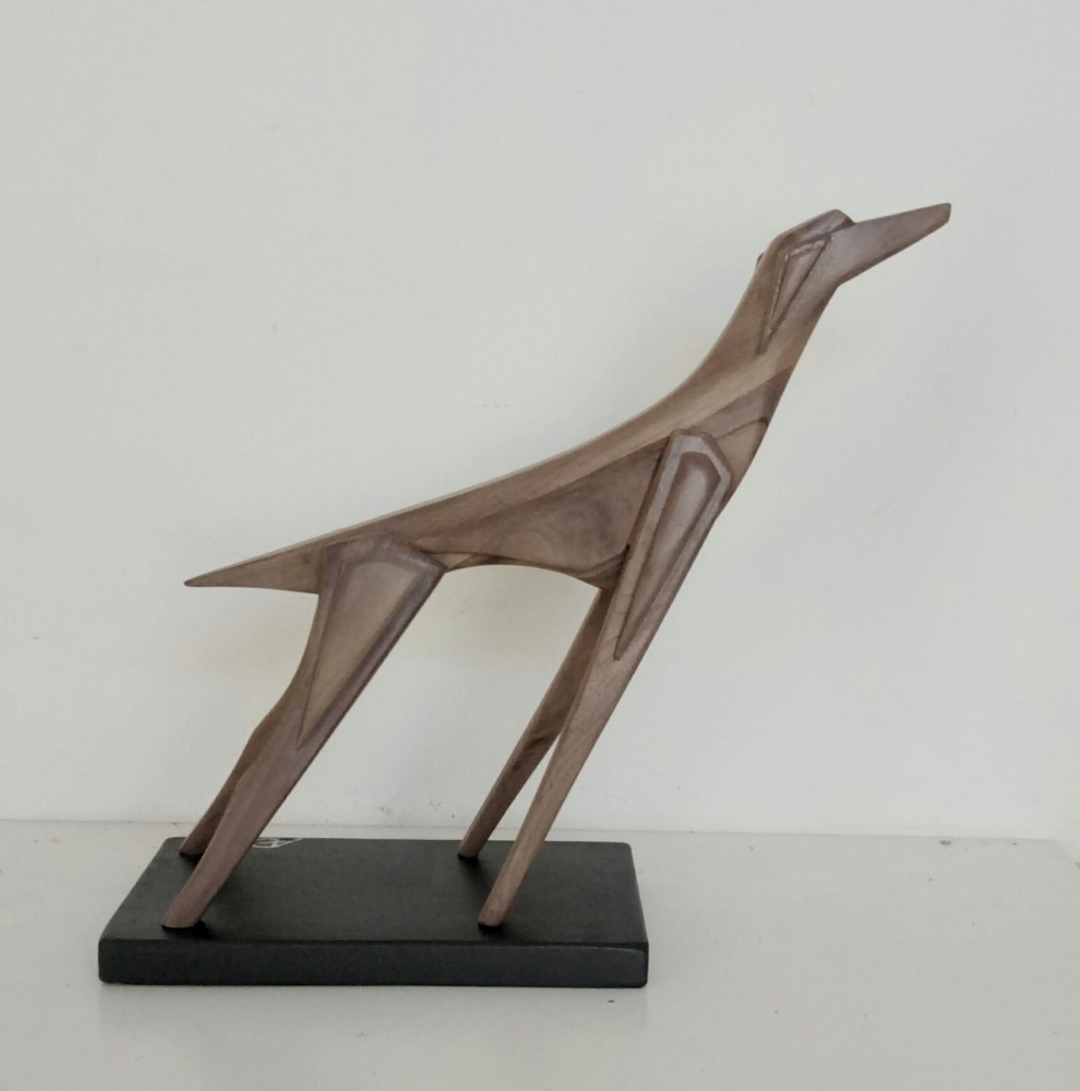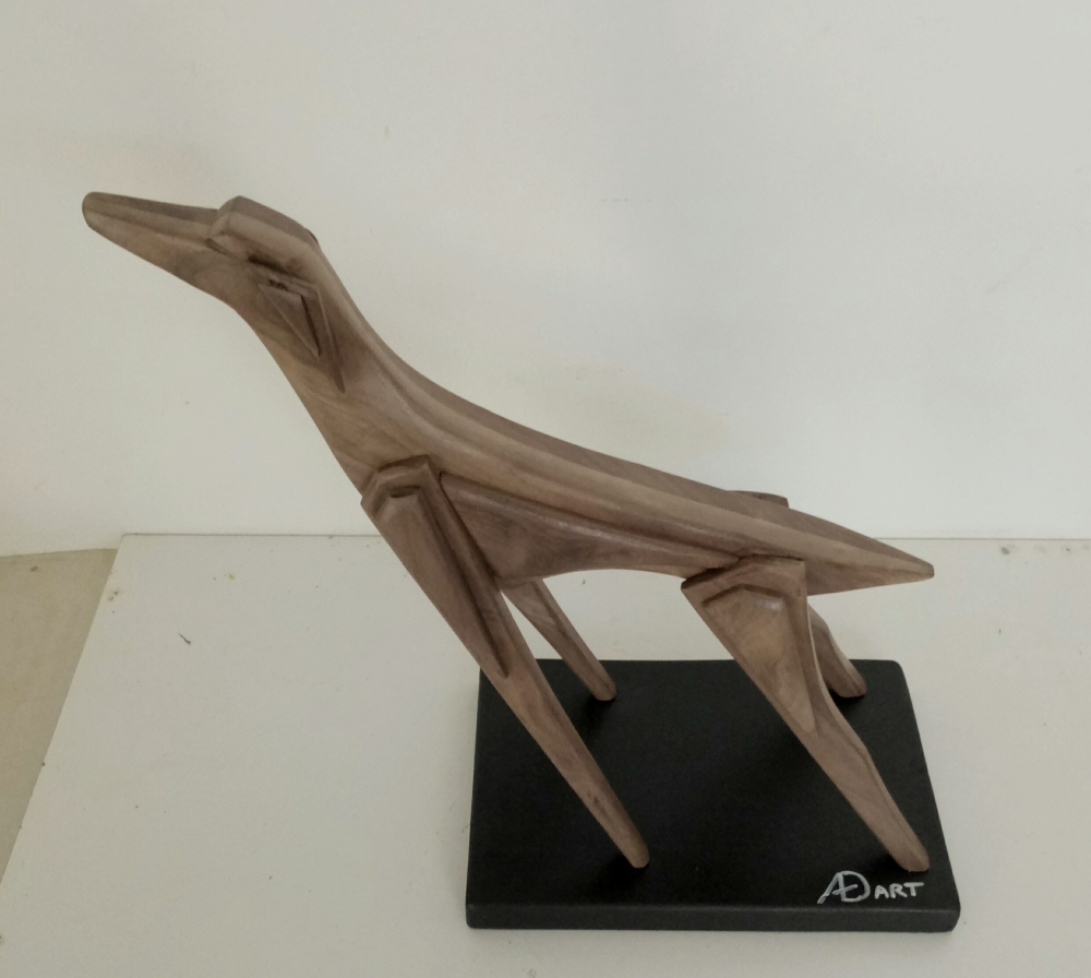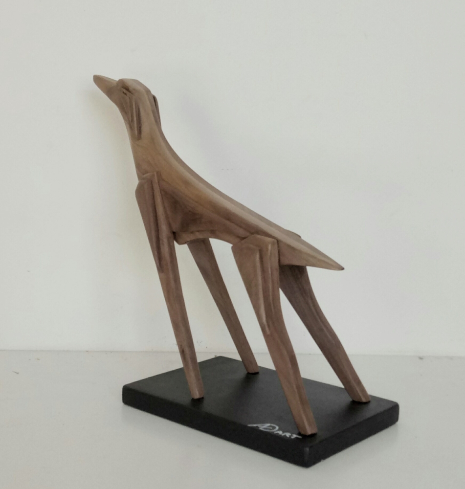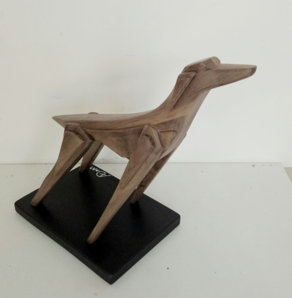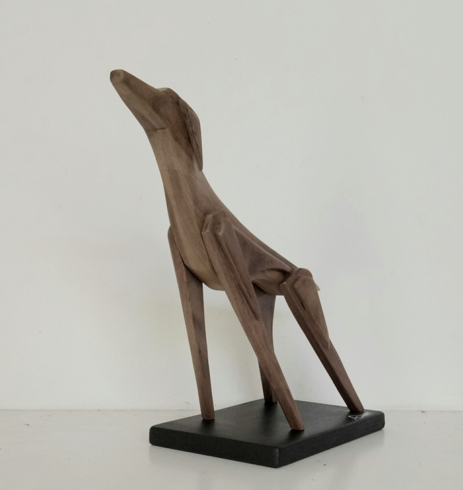 The "Geometric dog" artistic sculpture is made of solid walnut wood; clear water varnish finish. The sculpture is designed for interior decoration and takes on a different shape from every angle. The object takes the shape of a stylized and geometric dog. It is a unique piece Brand A+D art