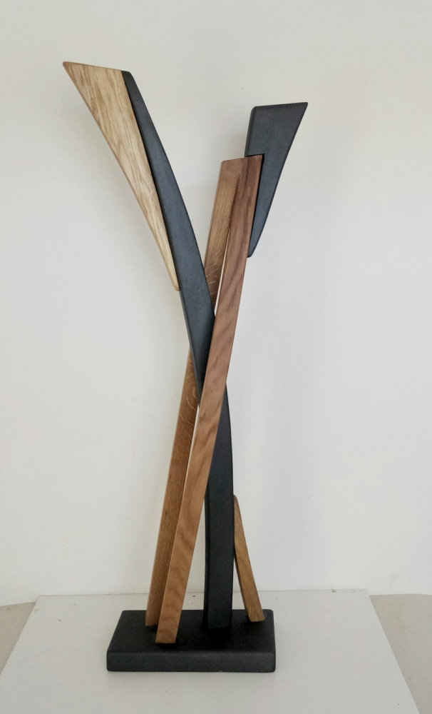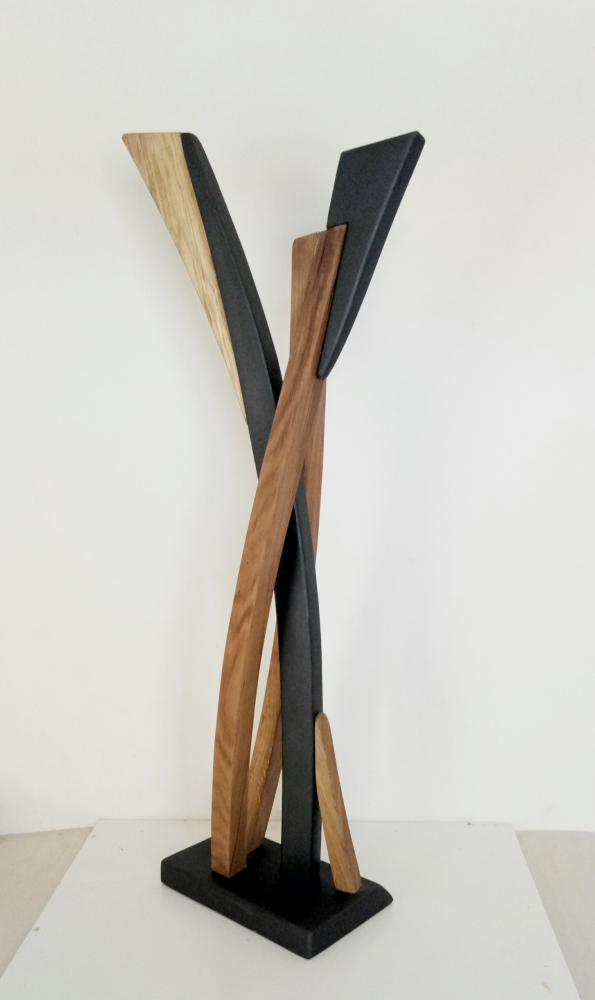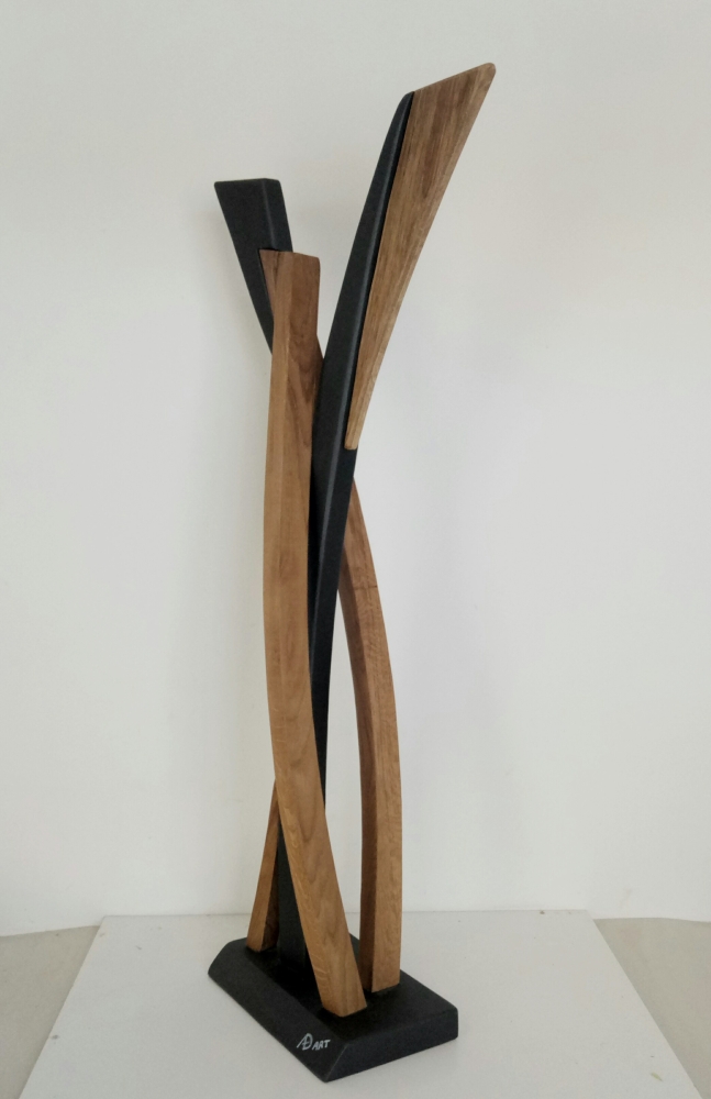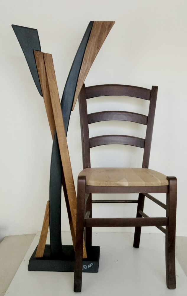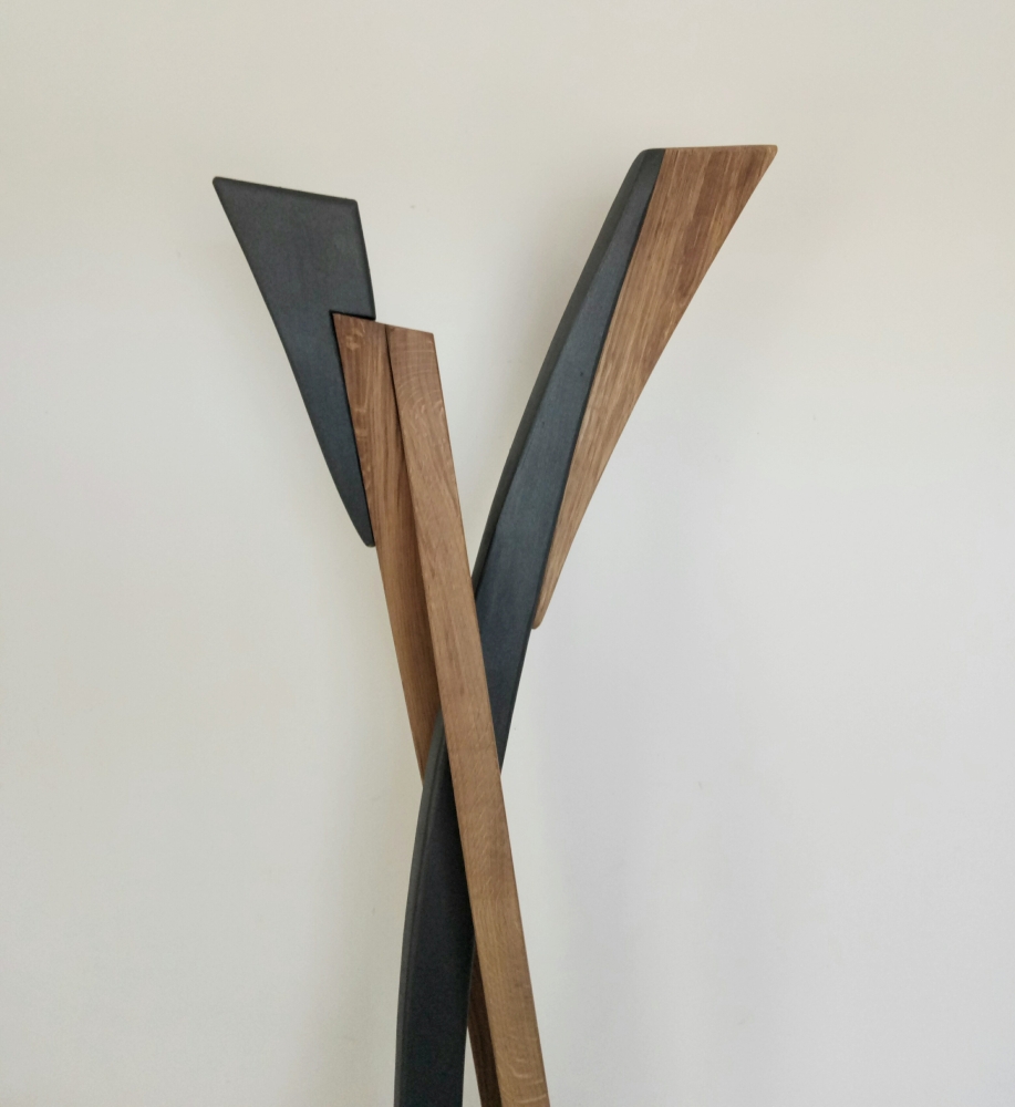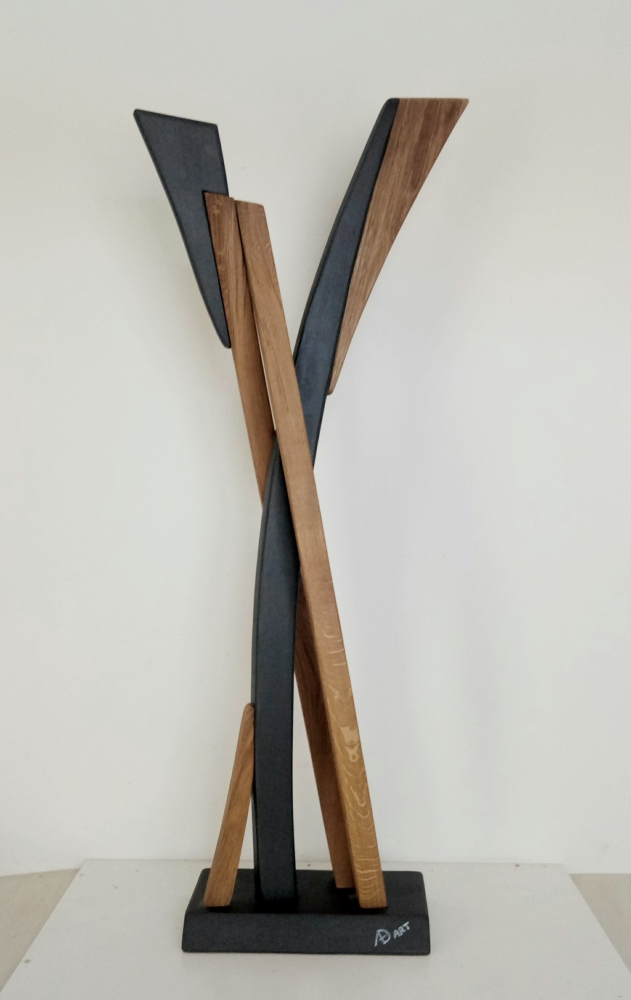 "Intertwined Dolmen" is a large artistic sculpture in solid oak and metal-effect paint; oil finish. It is an object that creates a unique atmosphere in the environment in which it is located and, if illuminated, creates suggestive shadows. In its forms, the work follows the original structure of the wooden plank from which it was made and is a unique piece. Brand A + D art