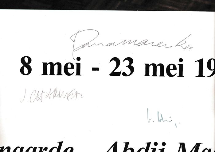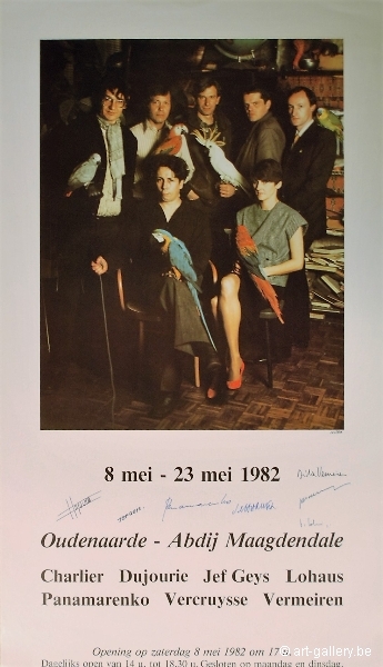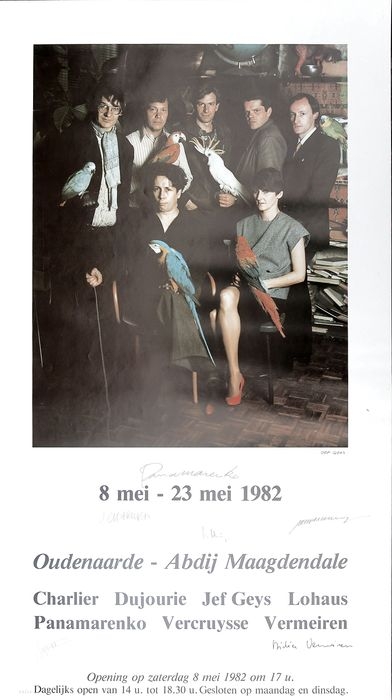 Panamarenko maakte deze iconische foto in eigen atelier (hij houdt het peertje in zijn hand om af te drukken). Van links naar rechts zien we Jef Geys, Bernd Lohaus, Jacques Charlier, Didier Vermeiren en Jan Vercruysse, en zittend Panamarenko en Lili Dujourie. Allen behoren zij tot de meest vooraanstaande kunstenaars van die periode. Op Jacques Charlier na hebben ze allemaal een papegaai van Panamarenko in de hand of op de schouder. Vijftig exemplaren werden genummerd en gesigneerd door alle kunstenaars. Op dit exemplaar signeerde Panamarenko breeduit in het midden onder de foto, en Jef Geys rechts onderaan, alsof hij er de auteur van is (maar de plaats van de handtekeningen varieert van het ene exemplaar tot het andere). Deze gezochte prent werd uitgegeven door Jan Dewilde te Oudenaarde. Met bijhorend certificaat uitgegeven door de PanamarenkoShop. Dit is nummer 22/50. afmetingen zijn 88,5 x 50 aangeboden zonder lijst