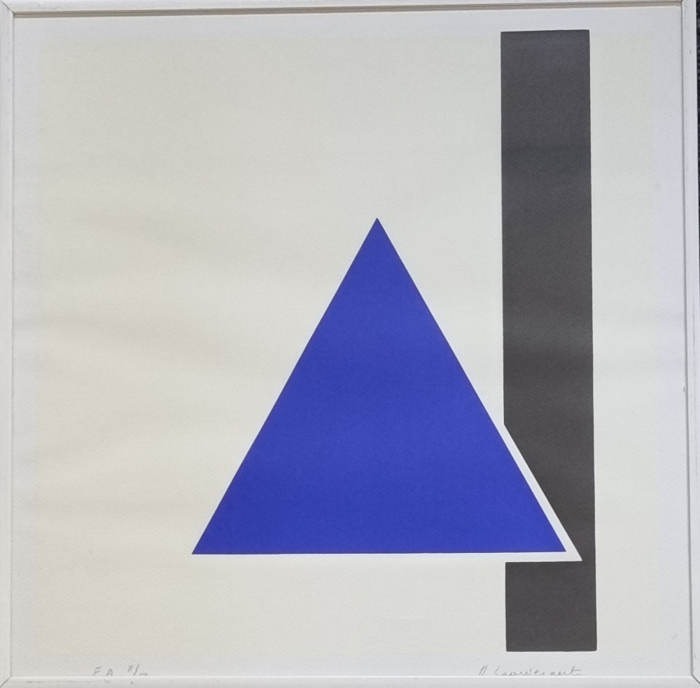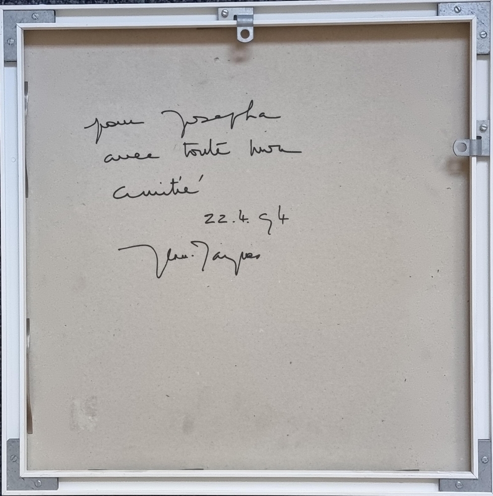Mooi en zelfzaam werk van Jean Jacques Bauweraerts Gesigneerd en genummerd (EA) Ingelijst Met persoonlijke boodschap op achterzijde. Autodidacte, il peint ses premières uvres abstraites en 1981. Puis collages, découpages et gravures de 1982 à 1984. Premières toiles assemblées à partir de 1986. En 1987, rencontre Sol Lewitt et devient son assistant pour lexposition Wall Drawings à lARC à Paris ; premières toiles superposées. Cofondateur de la revue Mesures le 23 janvier 1988 avec e.a. M.L.Baugniet, Jo Delahaut, Jean-Pierre Maury.