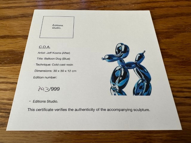 Resin sculpture after Jeff Koons, published by Éditions Studio. Blue is very rare. Only 999 pieces were produced. This is the first edition and was sold out in only a few minutes. The sculpture comes with the original packaging and is accompanied by the original certificate. Sculpture is in very good to excellent condition. Very solid investment in these times. Safe, fast and secured shipping.