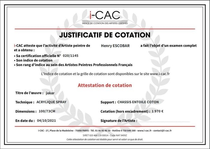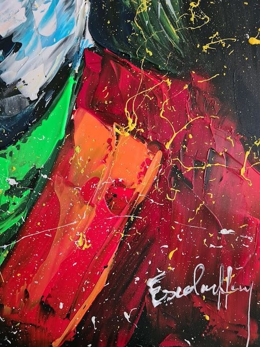 HENRY ESCOBAR - Joker - ORIGINAL ACRYLIC PAINTING - HAND SIGNED - COA Spanish artist Henry Escobar studied Applied Arts and perfected his painting and drawing skills by visiting studios. Quickly developing a realistic and figurative style, his rating keeps rising. Personal exhibitions: Madrid, Barcelona, Brussels, Miami, London, Paris, Geneva, Lausanne, Lyon, Belfort, Deauville, Nice, Dijon, Monaco. Unique work. Certificate of authenticity included. Technique: Palette knife acrylic painting with great thickness on linen canvas, mounted on adjustable wooden stretcher. Protected by a coat of anti-UV varnish. Original acrylic painting Perfect condition Certificate of Authenticity i-CAC (Indice de Cotation des Artistes Certifiés): 1970 Size: 100×2,5×73 cm Year: 2021