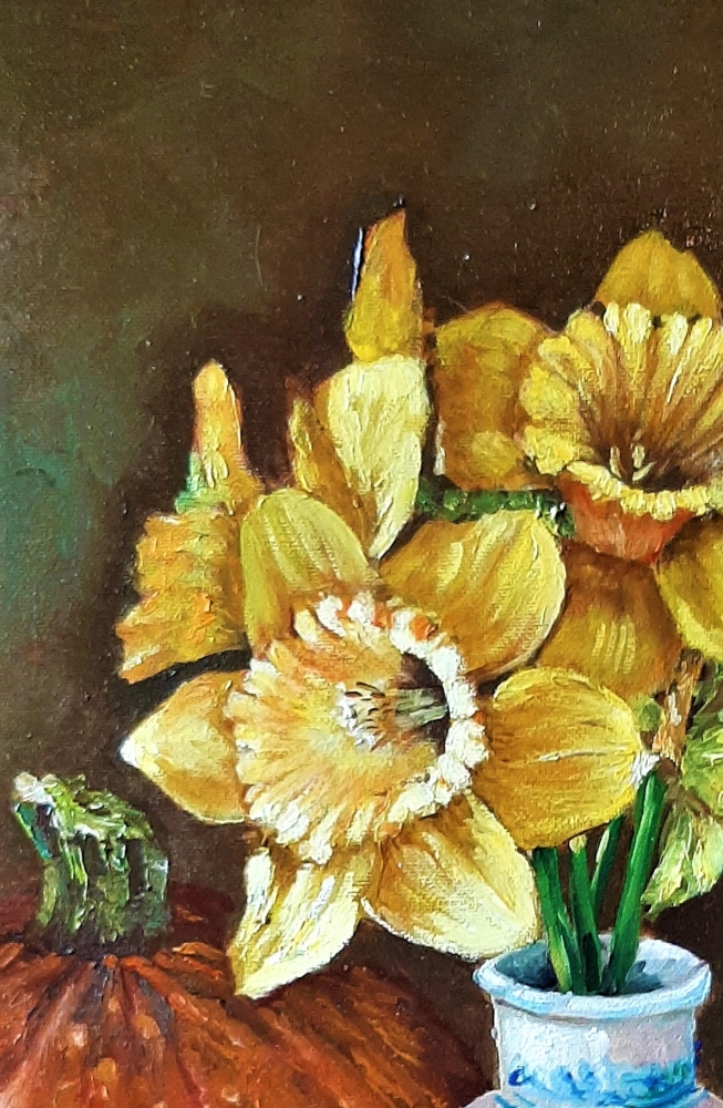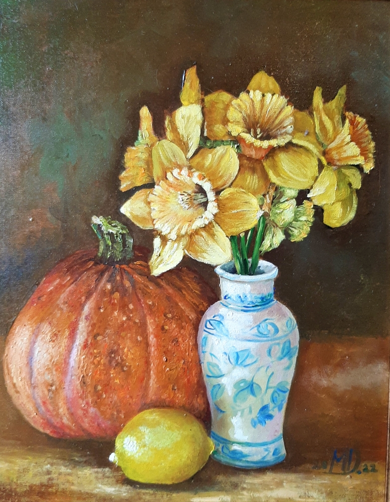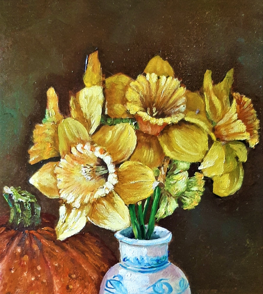 Yellow Daffodil-oil on canvas,57/47cm,year 2022,signed Denis Mihai. Mihai Denis is a professional painter with rich artistic experience and outstanding talent. Born into a family that cultivated a love of visual art, Mihai began painting as a child and continued to develop his artistic skills during adolescence and university studies. With a particular passion for contemporary art, Mihai Denis has created a diverse range of works in different styles and subjects, thus demonstrating his extensive skills and creativity in the field of art. He is known for his innovative approach to painting techniques, which involves the use of color blends and attractive textures, creating fascinating visual effects in his works.