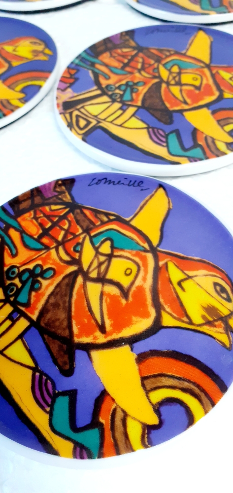 Special Editions Corneille (1922-2010) Set of six ceramic Corneille Coasters They are very colorful Moreover, the bottom has a protective layer of rubber Diameter: 10.5 cm In good condition Signed: Corneille.