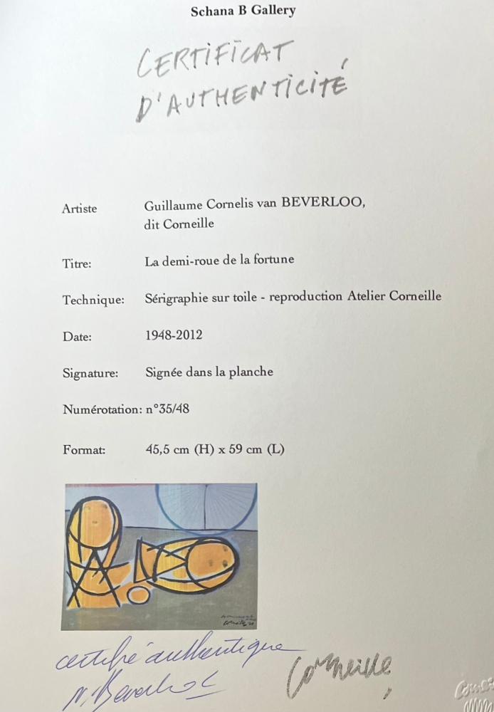 Retrospective of Corneille's work, which ended on 15 January at the Cobra Museum in Amstelveen. Cobra exhibition with the largest American collection of Corneille in Miami in spring and summer 2023. Release of a Cobra / Corneille stamp at Bpost in 2023 Corneille jewellery on display at the Boghossian Foundation until 14 May 2023 (Ornamentum, Diane Venet Collection) Large silkscreen on canvas reproducing an original work of 1948, signed, dated and titled in the plate. Ready to be hung! Edition of only 48 copies celebrating the beginning of the Cobra movement, with the permission of the Fondation Corneille. N° 35/48 Total dimensions : 48 x 62 cm - 2012 - Delivered with a certificate of authenticity - Secure shipping with insurance by UPS Born in Liège to Dutch parents, Guillaume Corneille was one of the founding members of the Cobra group, along with Karel Appel, Constant, Dotremont, Asger Jorn, Joseph Noiret, then Lucebert, Alechinsky...