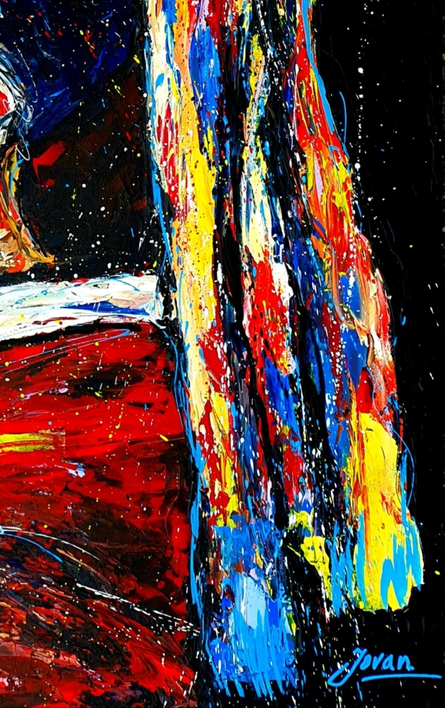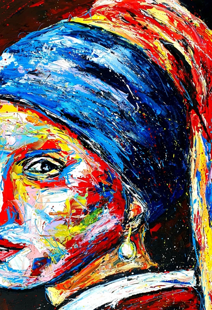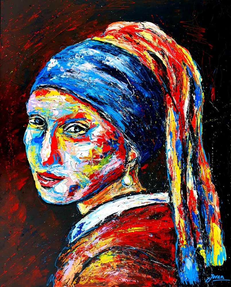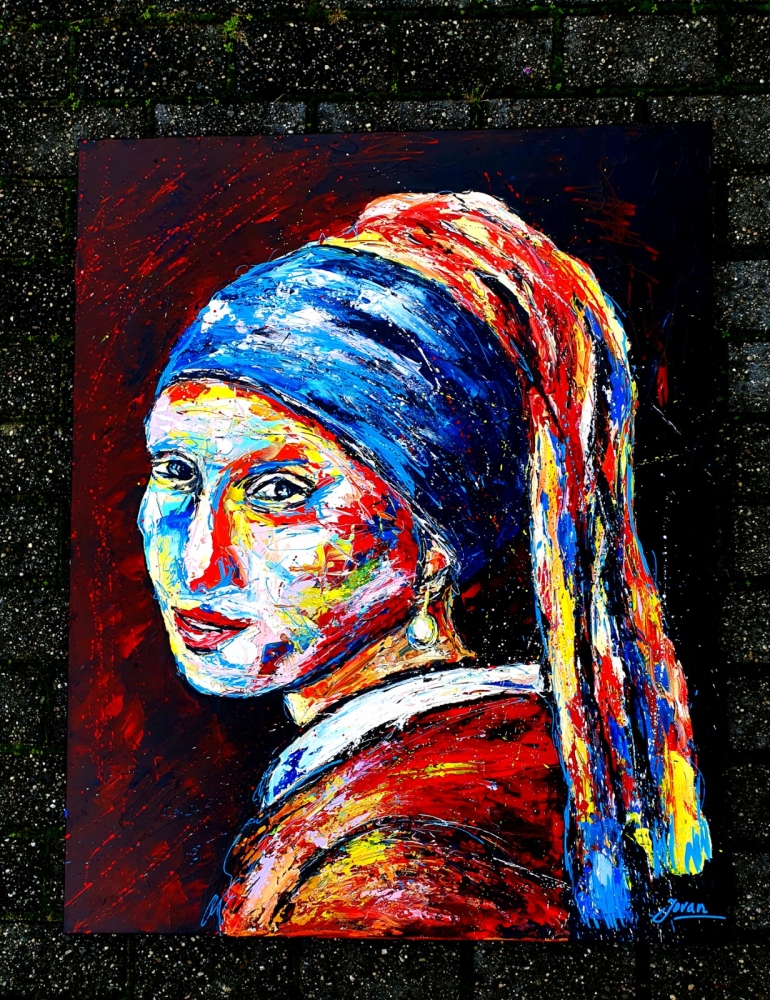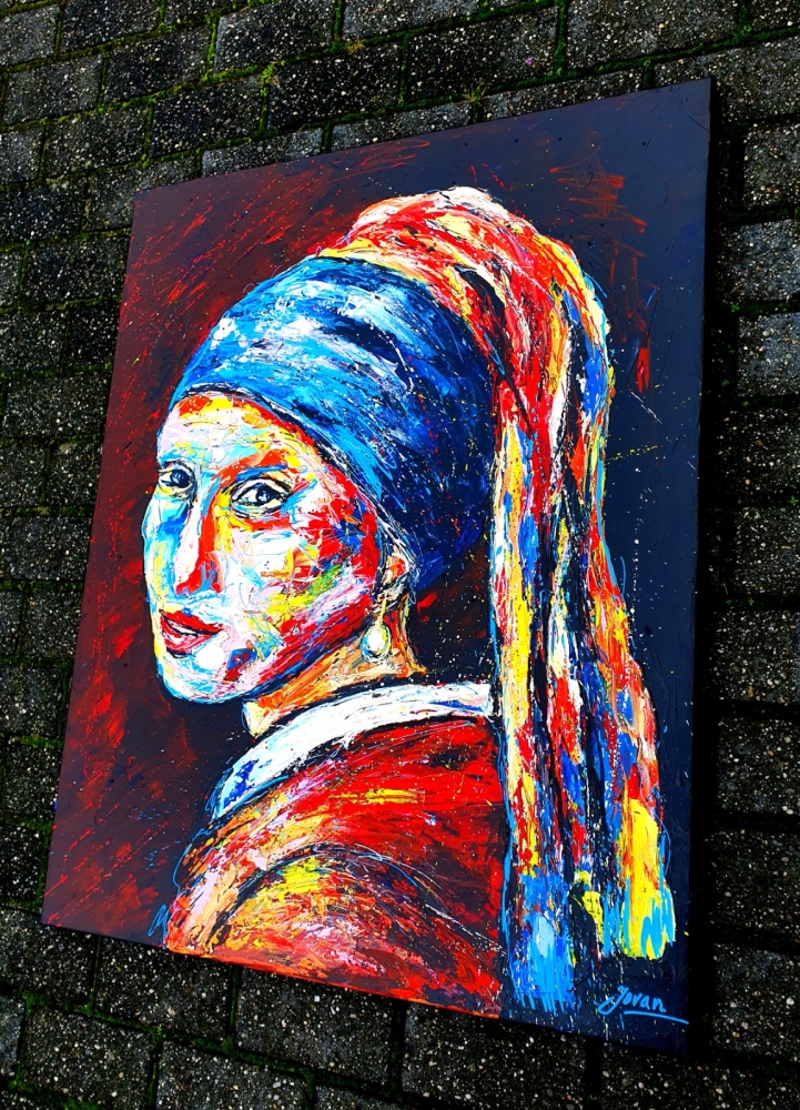 Originele abstract expressionistische werk (naar Vermeer) van Nederlandse professionele hedendaagse kunstenaar Jovan Srijemac (1962). Werk is geschilderd met palet mes en acrylverf op doek. Verf is expressief en met een veel dynamiek op doek aangebracht . Gelakt en met certificaat van echtheid Jovan Srijemac (1962) is een professionele kunstenaar gevestigd in Nederland die zijn schilderijen zowel nationaal als internationaal heeft geëxposeerd. Als professioneel kunstenaar sinds de jaren tachtig heeft zijn artistieke expressie in de loop der jaren verschillende vormen aangenomen. Hij omschrijft zijn stijl als een onbewuste, vaak chaotische en explosieve aanbrenging van verf op het doek, verborgen in ongeplande figuren, objecten en abstracte composities. Jovans levendige composities worden vaak gemaakt met een paletmes, maar zijn werken in Pop/Street Art-stijl gebruiken ook spuitverf, acrylstiften of pastelkrijt. Zijn werk wordt over de hele wereld verkocht aan particulieren, kunstverzamelaars en bedrijven. NB: Schilderijen zijn strak verpakt in meerdere lagen luchtfolie tussen dikke dozijn multiplex. Pakketten worden verzekerd verzonden met UPS of FedEx en dit biedt extra zekerheid qua bescherming en snelle levering van pakketten.