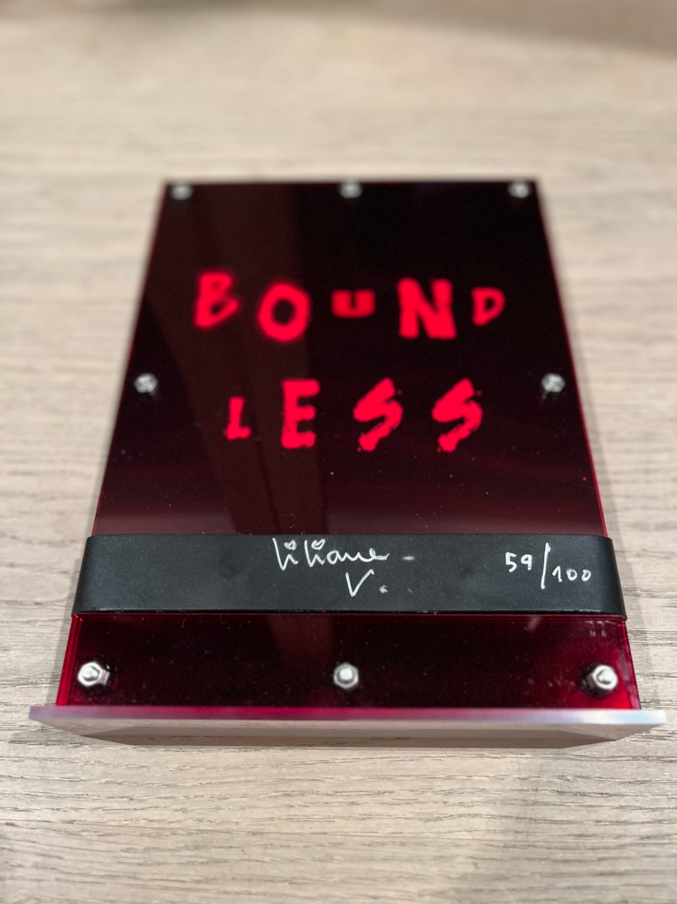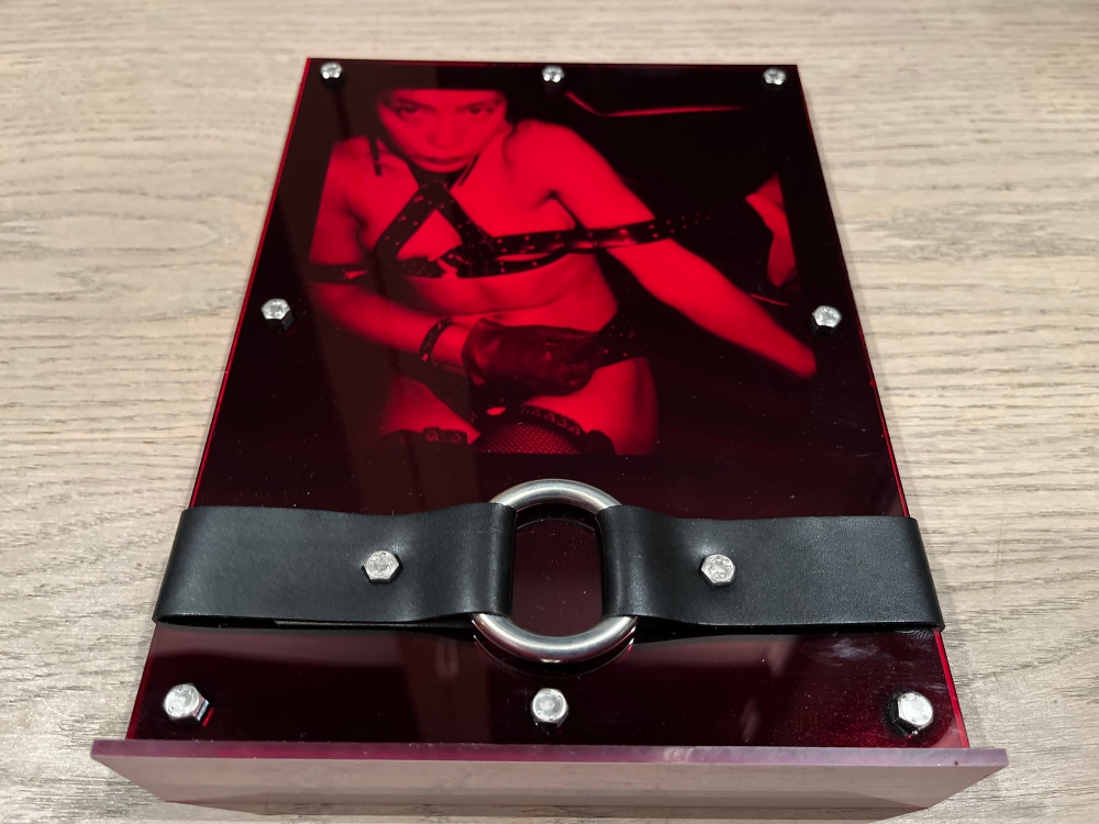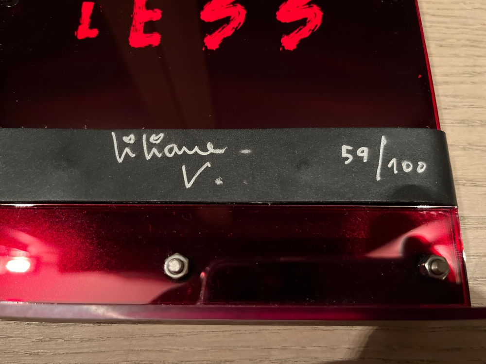 I am selling a beautiful Mixte Media Sculpture by Liliane Vertessen 1952. The artwork is called BOUND LESS. It consists of a picture between 2 red acrylic plates, screws and a leather strap. The piece is signed in silver marker by Liliane Vertessen and numbered 59/100. Dimensions of the piece 23,5cm x 17,5cm x 4cm. It is in perfect condition.