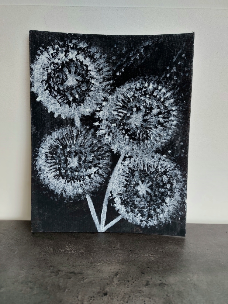 Hilde Roelandt schenkt 2 van haar schilderwerken en laat ons weten hoe zij hiertoe kwam. De eerste is een kerstboompje, een zielig klein boompje, dat daar zo alleen in een groot bos stond te pronken tot iemand het zag staan. Iedereen zei dat ze moesten gaan kijken, alleen dat klein boompje stond te schitteren in het grote bos misschien wil iemand mij in hun huisje zo dat ik ook daar mooi kan hangen of staan.