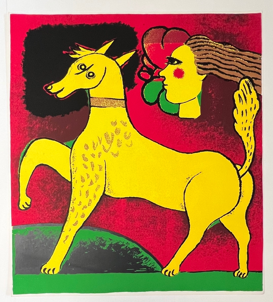 Beautiful silkscreen print from 1992 by Guillaume Corneille entitled "L'Ecuyère et son cheval", 60 x 54 cm. On thick vellum paper with Corneille's workshop stamp on the back. Very good condition Identified as an important figure in the renewal of abstraction in Northern Europe, from 1967 Corneille gradually moved towards a rich and colourful New Figuration that coordinated with the Pop Art taste of the 1960s and 1970s, and exhibited alongside Andy Warhol, Arman, César, etc.