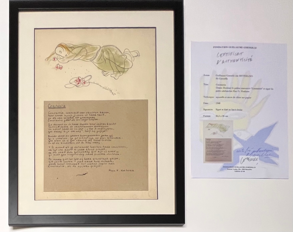 Beautiful original old work, painted by the painter at the age of 26, supplied with certificate of authenticity. Dimensions with frame: 48 x 37 cm, approx. Dimensions of the work : 36,5 x 26 cm. Atelier Corneille stamp on the reverse. Elegant signature in ink in the drawing : Corneille 48 Watercolour and India ink on paper. Constantia is the name of a peasant woman, tired of picking fruit, sunk in dreams, a bag of red apples spread around her. The poem was considered one of Han G. Hoekstra's best by Binnendijk in 1940. Guillaume Corneille (1922-2010) was born in Liège of Dutch parents and was a member of the Cobra group along with Constant, Dotremont, Karel Appel, Asger Jorn, Noiret, Doucet and Alechinsky.