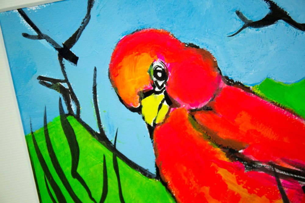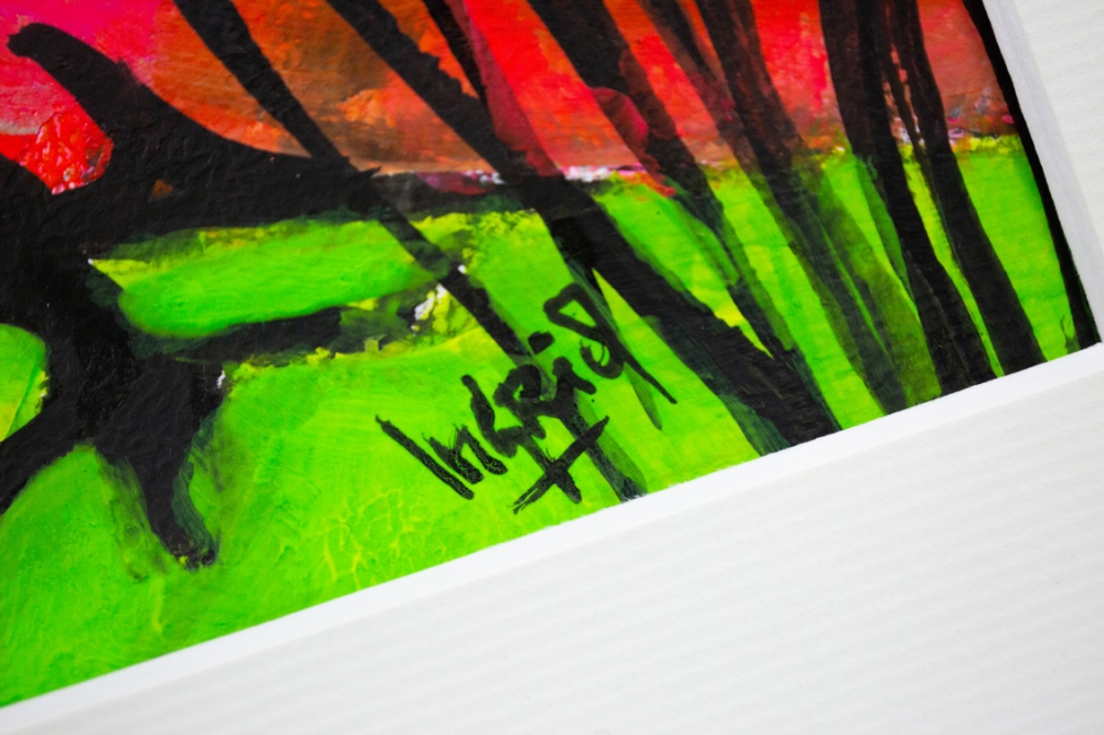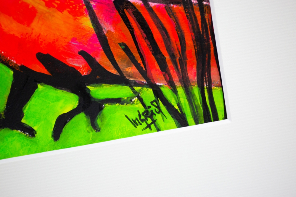 Levendig en kleurrijk werkje van Ingrid met Acrylverf en chinese inkt op papier. Ingrid (Janssen) is een Belgische schilder, grafisch ontwerper, opleiding aan de Academies van Doornik, Oostende en Duinkerken. Figuratieve stijl doordrenkt met symboliek.