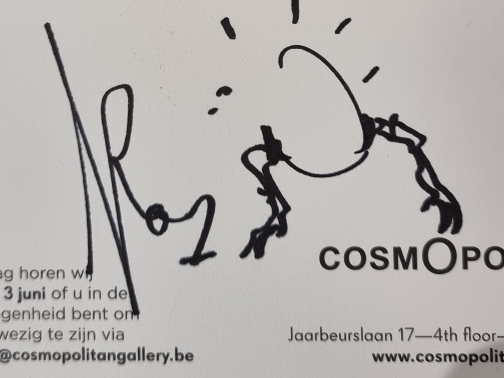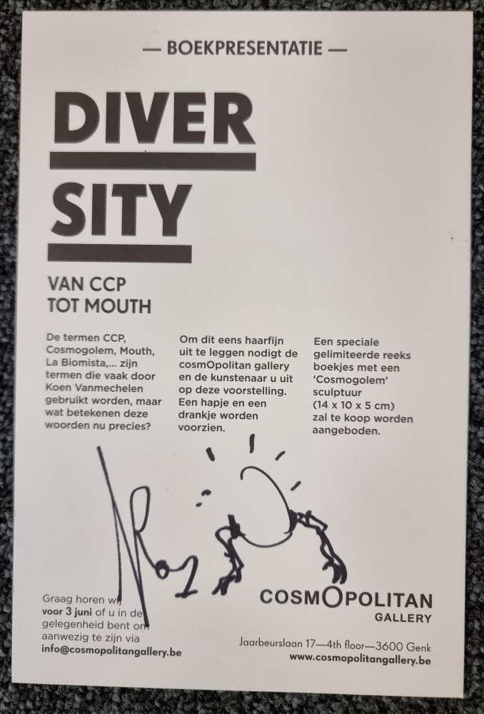 Prachtige originele tekening van Koen Van Mechelen, eveneens gesigneerd door de kunstenaar ter gelegenheid van "Diversity" in Cosmopolitan Gallery. De tekening is gemaakt op een (eveneens zeldzame) uitnodigingskaart op stevig papier/karton en is een weergave van "The Walking Egg" The Walking Egg project was born in Genk in 1997, in a meeting between Koen Vanmechelen and Willem Ombelet, a fertility specialist. The meeting took place in the context of an international congress on fertility and infertility. One of the results of that cross-fertilisation between art and fertility science was The Walking Egg Magazine, a periodical in which science, art and philosophy fertilise each other. The Walking Egg received its name from the eponymous artwork that Vanmechelen made for the congress. Its a egg-on-legs, walking about on the lookout for the right temperature and the right place to be hatched.