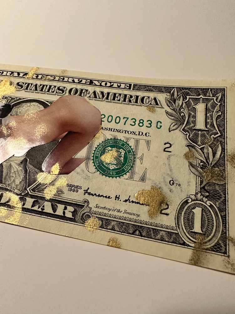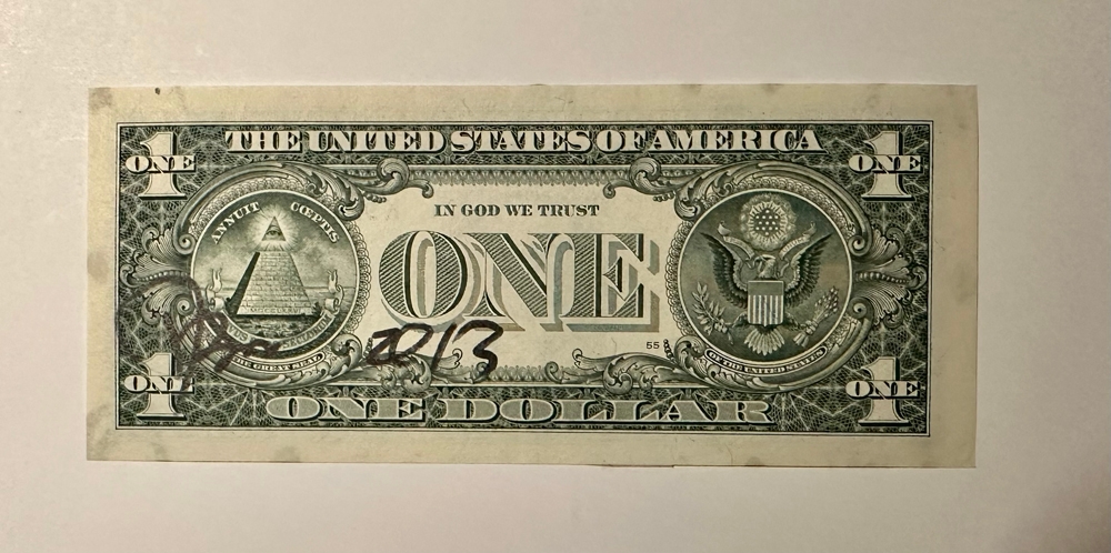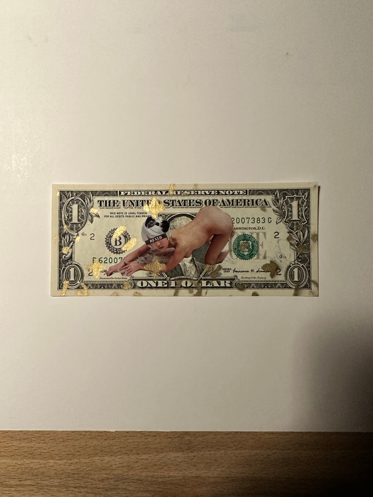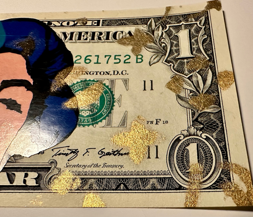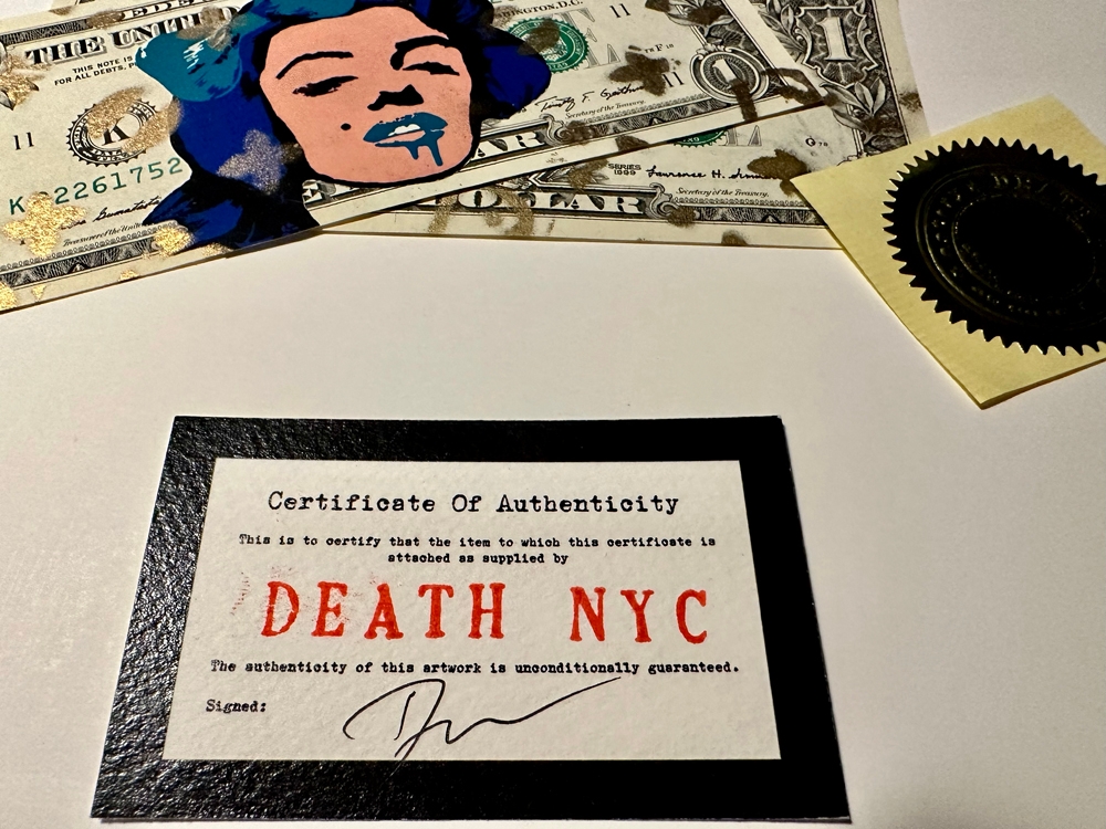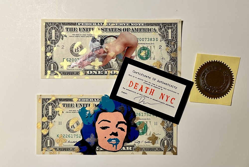 Death NYC - origineel werk - 2 dollarbiljetten Zeldzame dollarbiljetten van Death NYC. Techniek: Collage and marker. Handgesigneerd en gedateerd 2018 op elk biljet. Afmetingen per biljet: 7 x 15.5 cm Original artwork. In a perfect condition Met certificaatkaartje.