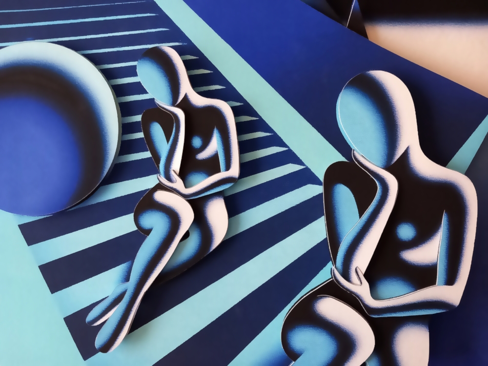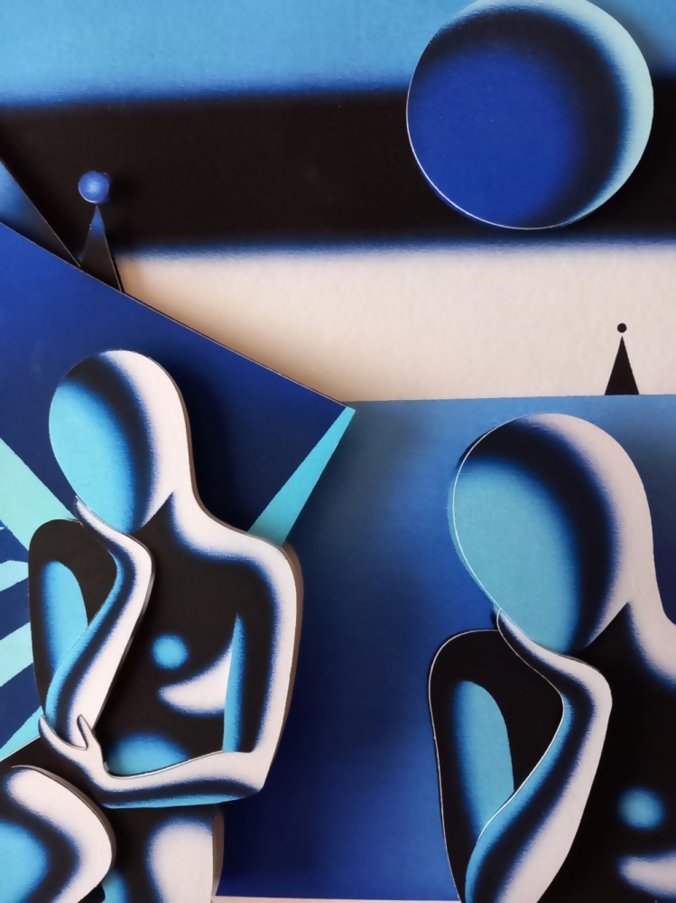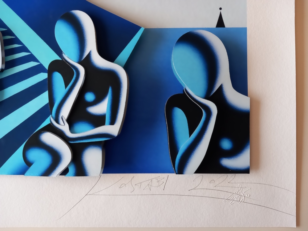 3D construction on Hahnemühle Velvet, 2022. Handsigned, -numbered 15/30 with blindstamp. 61*44,5*0,1 cm. Mark Kostabi (11/27/1960 Whittier (USA)) paints faceless, timeless figures, who can be all of us and none of us; they are reminiscent of De Chirico's mannequins, or works from Fernand Léger, and have a strong expressive charge.