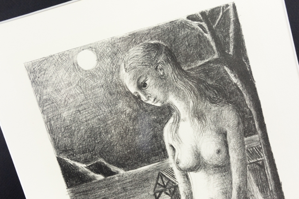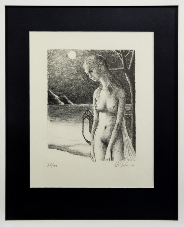 Een genummerde en gesigneerde lithografie van de hand van Paul Delvaux uit 1975. Uitgave gelimiteerd op 100 stuks, waarvan dit nummer 76 is.