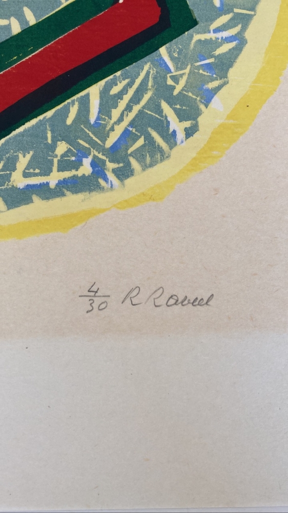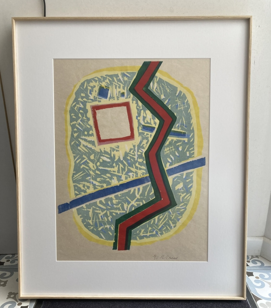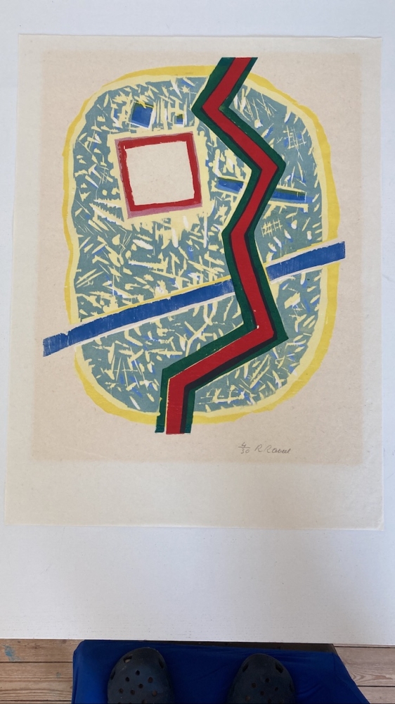 Krachtige kleurenhoutsnede gedrukt door Piet Clement en uitgegeven door printshop amsterdam. 1 van de 15 exemplaren gedrukt op japans. Nieuw ingekaderd in aluminium lijst (houtlook) en passe-partout. Levendige, diepe kleuren.