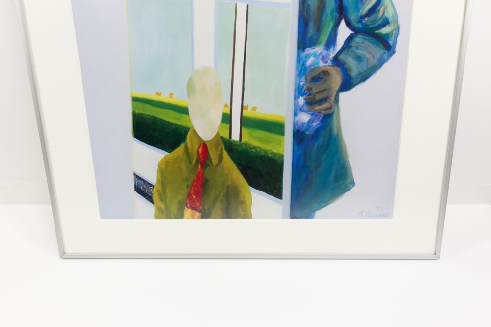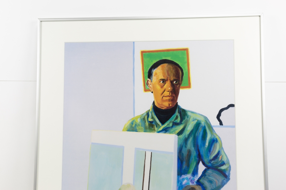 Hoogwaardige offsetkleurendruk van 'Zelfportret met schilderij' een olieverfschilderij van Roger Raveel uit 1974.