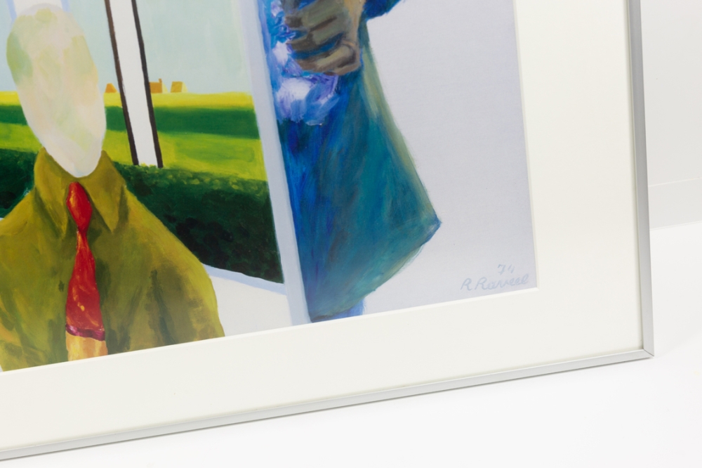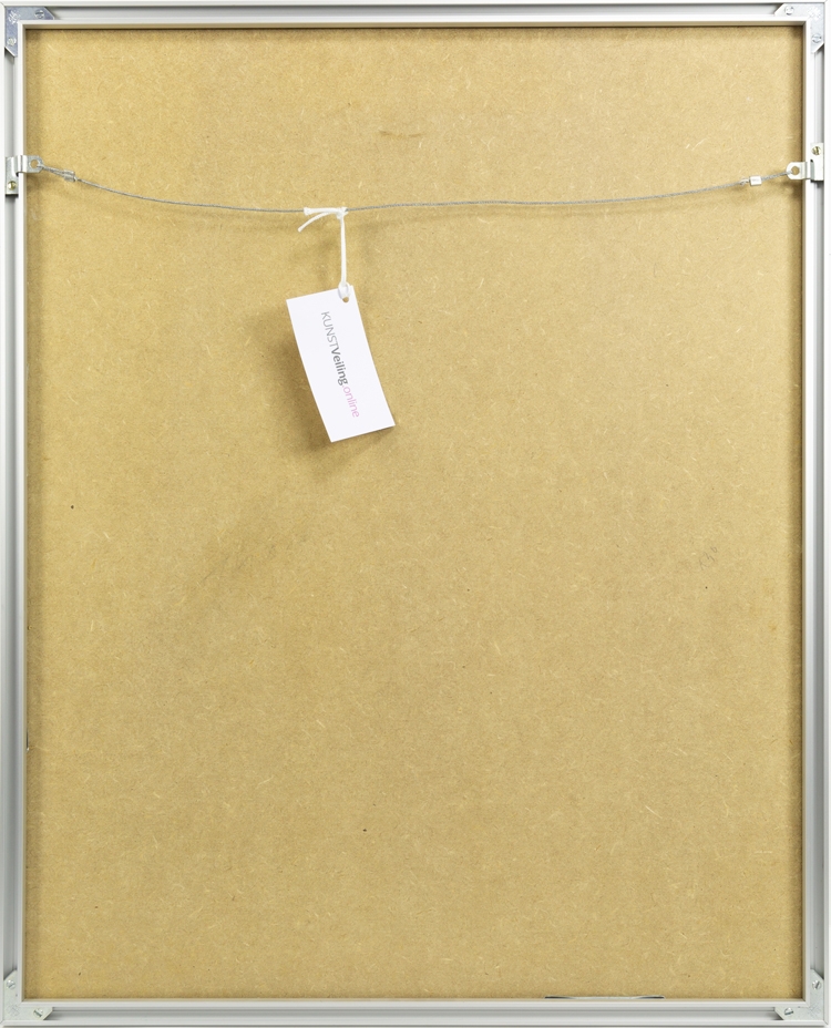 Druk in uitstekende kwaliteit. Ingelijst in een sober wit kader met ontspiegeld glas.
