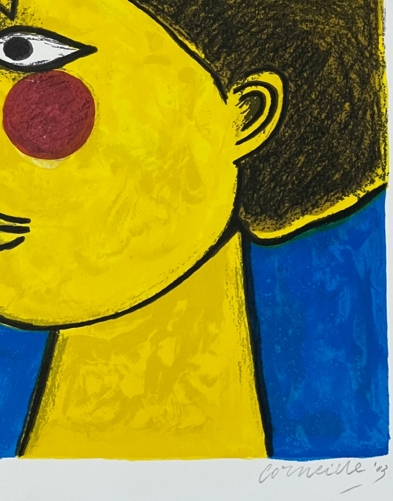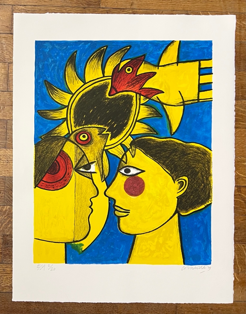 Original lithograph by the painter Guillaume Corneille (1922-2010), born in Liège to Dutch parents and founding member of the Cobra group with Karel Appel, Asger Jorn, Constant, Dotremont and later Alechinsky and Jacques Doucet "Idyll" Signed and dated in graphite by the hand of the artist Numbered E/A 2/20 - Atelier Corneille stamp on the back. Total dimensions: 65 x 50 cm Perfect condition - Secure shipping with UPS Grand Master of color, in the wake of Gauguin or Matisse, Guillaume Corneille creates a jovial and colorful world that celebrates harmony with nature. The lithographic impression is of such quality that it gives the impression of having the brushstrokes in front of you. In the 1990s, Corneille set up his studio in the middle of his garden facing the wheat fields painted by Van Gogh. We find here the starry stars and the yellow Van Gogh which makes this amorous encounter a solar encounter.