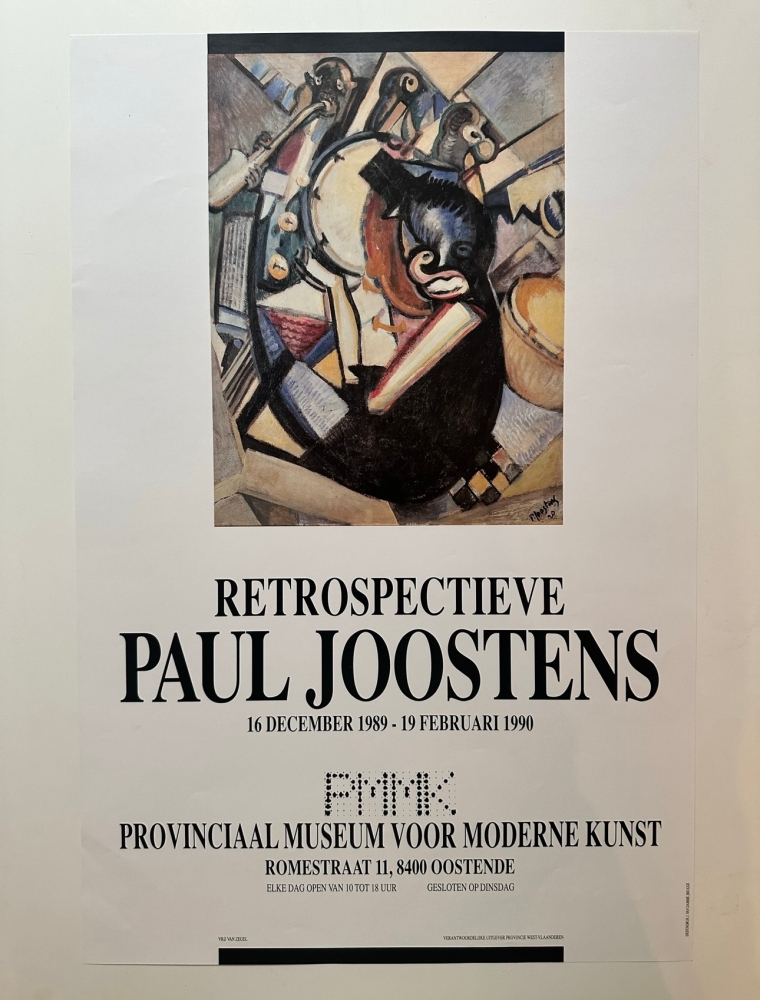 Affiche uit 1989 voor de tentoonstelling van Paul Joostens in het PMMK Paul Joostens was een eigenzinnig Belgisch kunstschilder, tekenaar en maker van collages. Hij was kortstondig een impressionist, daarna een symbolist, futurist, kubist, surrealist, dadaïst, anarchist, nihilist en uiteindelijk existentialist