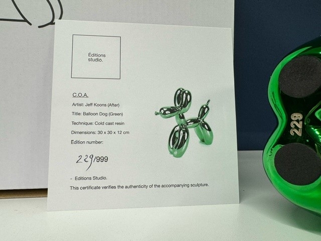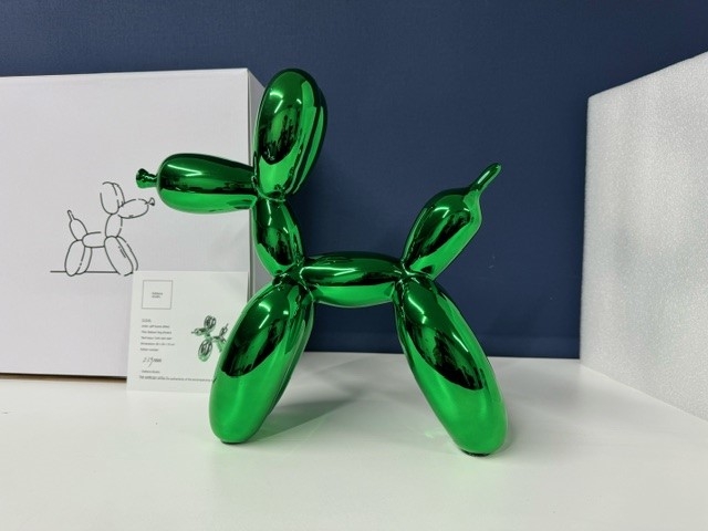 Balloon Dog in 'GREEN'. Originele verpakking en certificaat aanwezig. Na de release binnen enkele minuten uitverkocht! Dit is de eerste zeldzame uitgave gelimiteerd op 999 stuks wereldwijd. Dit is nr. 229. Zeer solide en interessante investering. Zorgvuldige, snelle en verzekerde verzending. Meer info: Jeffrey Jeff Koons (geboren 21 januari 1955) is een Amerikaanse kunstenaar wiens werk wordt gedomineerd door de themas banaliteit en verleiding. Hij woont en werkt in zowel New York City en zijn woonplaats York, Pennsylvania. Jeff Koons is zonder twijfel een van de belangrijkste levende kunstenaars en zijn werk is opgenomen in de meest vooraanstaande hedendaagse (museum) collecties ter wereld. Koons zijn verdienste ligt in het verwerken van kitscherige elementen in Kunst met de grote K, waardoor zijn werk, in één adem met dat van Andy Warhol, postmodernistisch wordt genoemd. Koons werk vertoont overeenkomsten met Pop Art, in zoverre dat hij elementen uit lagere kunst haalt en deze verwerkt in hogere kunst. Zijn werk wordt tot de categorie Neo Pop Art gerekend waarbij men in het geval van Koons spreekt van überkitsch: kitsch die zo sterk wordt aangezet, dat die niet meer te genieten is en juist daaraan zijn kunstzinnigheid ontleent. De werken van Koons worden verkocht voor astronomische bedragen, zo werd in 2013 tijdens een hedendaagse kunstveiling bij Christies in New York Koonss Balloon Dog Orange verkocht voor ruim 58 miljoen dollar, het duurste werk ooit voor een nog levende kunstenaar. Van de Balloon Dog heeft Jeff Koons een aantal gelimiteerde reproducties vervaardigd welke bij Kunsthuizen verkrijgbaar zijn.
