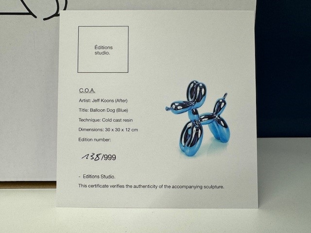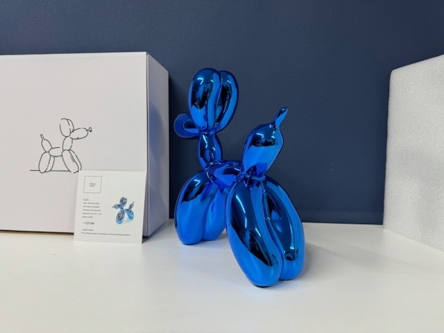 Balloon Dog in 'BLUE'. Originele verpakking en certificaat aanwezig. Na de release binnen enkele minuten uitverkocht! Dit is de eerste zeldzame uitgave gelimiteerd op 999 stuks wereldwijd. Dit is nr. 138. Zeer solide en interessante investering. Zorgvuldige, snelle en verzekerde verzending. Meer info: Jeffrey Jeff Koons (geboren 21 januari 1955) is een Amerikaanse kunstenaar wiens werk wordt gedomineerd door de themas banaliteit en verleiding. Hij woont en werkt in zowel New York City en zijn woonplaats York, Pennsylvania. Jeff Koons is zonder twijfel een van de belangrijkste levende kunstenaars en zijn werk is opgenomen in de meest vooraanstaande hedendaagse (museum) collecties ter wereld. Koons zijn verdienste ligt in het verwerken van kitscherige elementen in Kunst met de grote K, waardoor zijn werk, in één adem met dat van Andy Warhol, postmodernistisch wordt genoemd. Koons werk vertoont overeenkomsten met Pop Art, in zoverre dat hij elementen uit lagere kunst haalt en deze verwerkt in hogere kunst. Zijn werk wordt tot de categorie Neo Pop Art gerekend waarbij men in het geval van Koons spreekt van überkitsch: kitsch die zo sterk wordt aangezet, dat die niet meer te genieten is en juist daaraan zijn kunstzinnigheid ontleent. De werken van Koons worden verkocht voor astronomische bedragen, zo werd in 2013 tijdens een hedendaagse kunstveiling bij Christies in New York Koonss Balloon Dog Orange verkocht voor ruim 58 miljoen dollar, het duurste werk ooit voor een nog levende kunstenaar. Van de Balloon Dog heeft Jeff Koons een aantal gelimiteerde reproducties vervaardigd welke bij Kunsthuizen verkrijgbaar zijn.