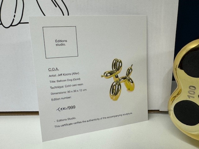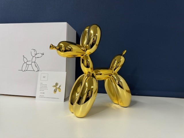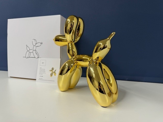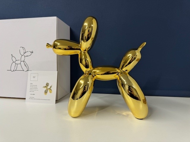 Balloon Dog in 'GOLD'. Originele verpakking en certificaat aanwezig. Na de release binnen enkele minuten uitverkocht! Dit is de eerste zeldzame uitgave gelimiteerd op 999 stuks wereldwijd. Dit is nr. 100!! Zeer solide en interessante investering. Zorgvuldige, snelle en verzekerde verzending. Meer info: Jeffrey Jeff Koons (geboren 21 januari 1955) is een Amerikaanse kunstenaar wiens werk wordt gedomineerd door de themas banaliteit en verleiding. Hij woont en werkt in zowel New York City en zijn woonplaats York, Pennsylvania. Jeff Koons is zonder twijfel een van de belangrijkste levende kunstenaars en zijn werk is opgenomen in de meest vooraanstaande hedendaagse (museum) collecties ter wereld. Koons zijn verdienste ligt in het verwerken van kitscherige elementen in Kunst met de grote K, waardoor zijn werk, in één adem met dat van Andy Warhol, postmodernistisch wordt genoemd. Koons werk vertoont overeenkomsten met Pop Art, in zoverre dat hij elementen uit lagere kunst haalt en deze verwerkt in hogere kunst. Zijn werk wordt tot de categorie Neo Pop Art gerekend waarbij men in het geval van Koons spreekt van überkitsch: kitsch die zo sterk wordt aangezet, dat die niet meer te genieten is en juist daaraan zijn kunstzinnigheid ontleent. De werken van Koons worden verkocht voor astronomische bedragen, zo werd in 2013 tijdens een hedendaagse kunstveiling bij Christies in New York Koonss Balloon Dog Orange verkocht voor ruim 58 miljoen dollar, het duurste werk ooit voor een nog levende kunstenaar. Van de Balloon Dog heeft Jeff Koons een aantal gelimiteerde reproducties vervaardigd welke bij Kunsthuizen verkrijgbaar zijn.