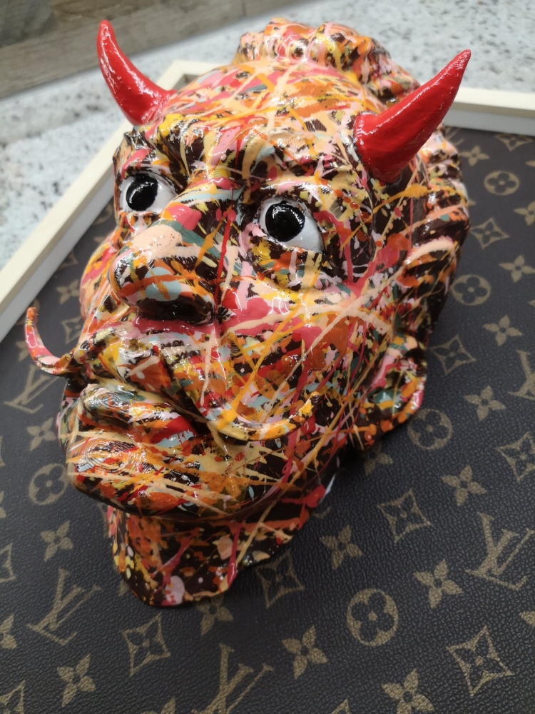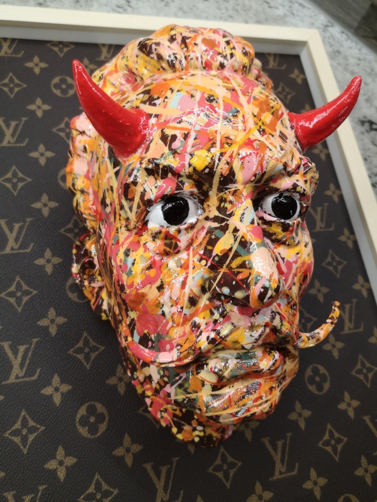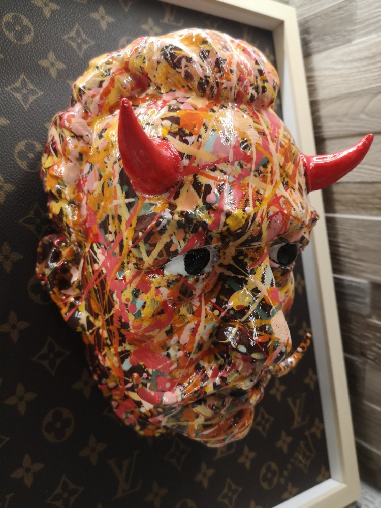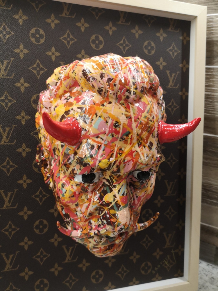 Dali is the devil by Louis Vuitton Editie : 6 / 10 Het werk geeft Salvador Dali weer in meer dan 30 diverse kleuren besprenkeld met rode duivels hoornen en waar de ogen bewust niet besprenkeld zijn en de pupillen mooi uitspringen uit het werk. Salvador Dali is the devil is gekozen omdat Dali staat voor absurde abstracte wanorde in tegenstelling tot het keurig in patroon lopend design van Louis Vuitton. Het werk hangt op een achtergrond van het bekende faux leather vel in bruin met goudkleurig Louis Vuitton patroon. Afgewerkt met diverse lagen epoxy en HQ gloss. Het geheel is ingekaderd in een mooi houten kader in houtkleur met witte dieptekader . Komt met een certificaat van authenticity.