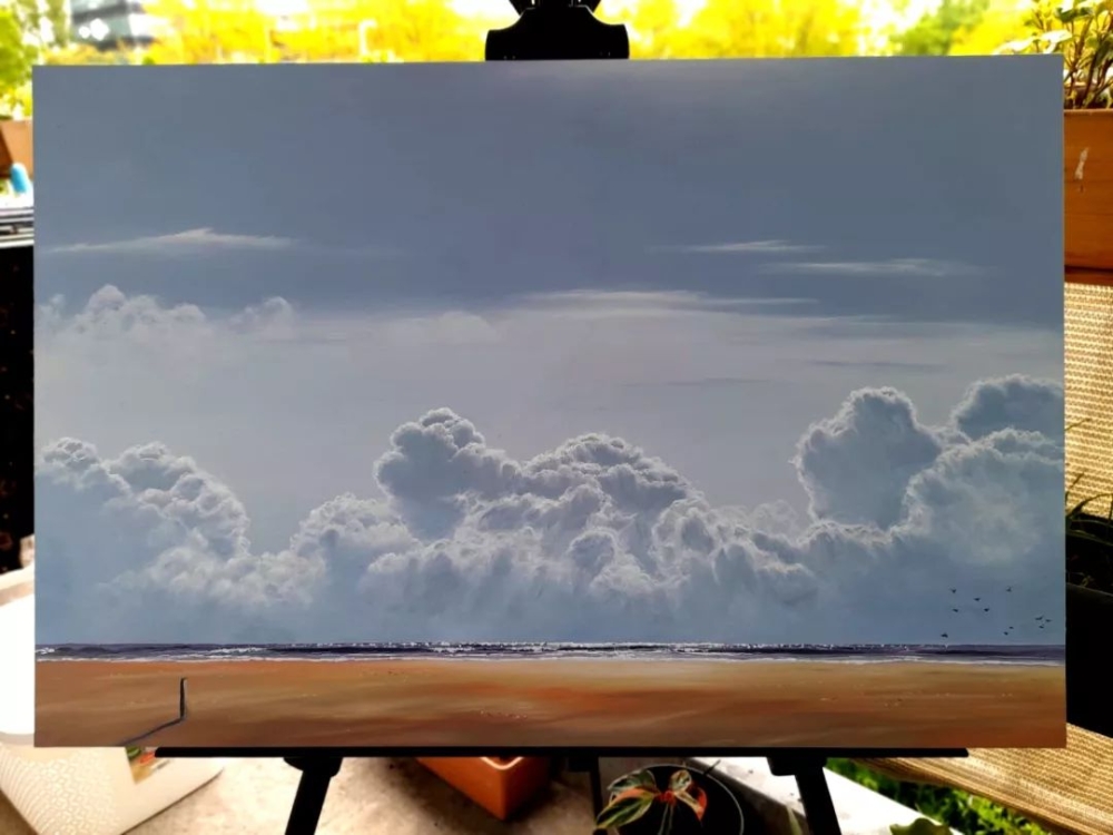 Olieverf op paneel, 40x60cms. Dit is een handgeschilderd realistisch zegezicht. Eeen cumulus wolk is zich in de verte aan het formeren boven de Nederlandse kust ter plaatse van de Maasvlakte. Het zonlicht verlicht de hoogste pieken van deze wolk.