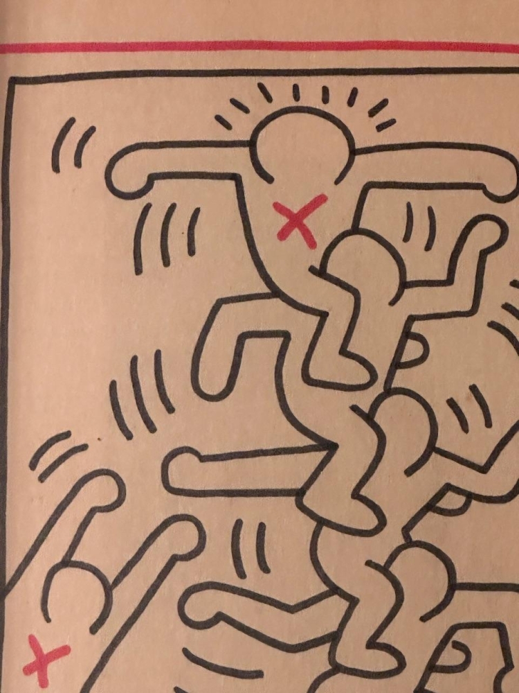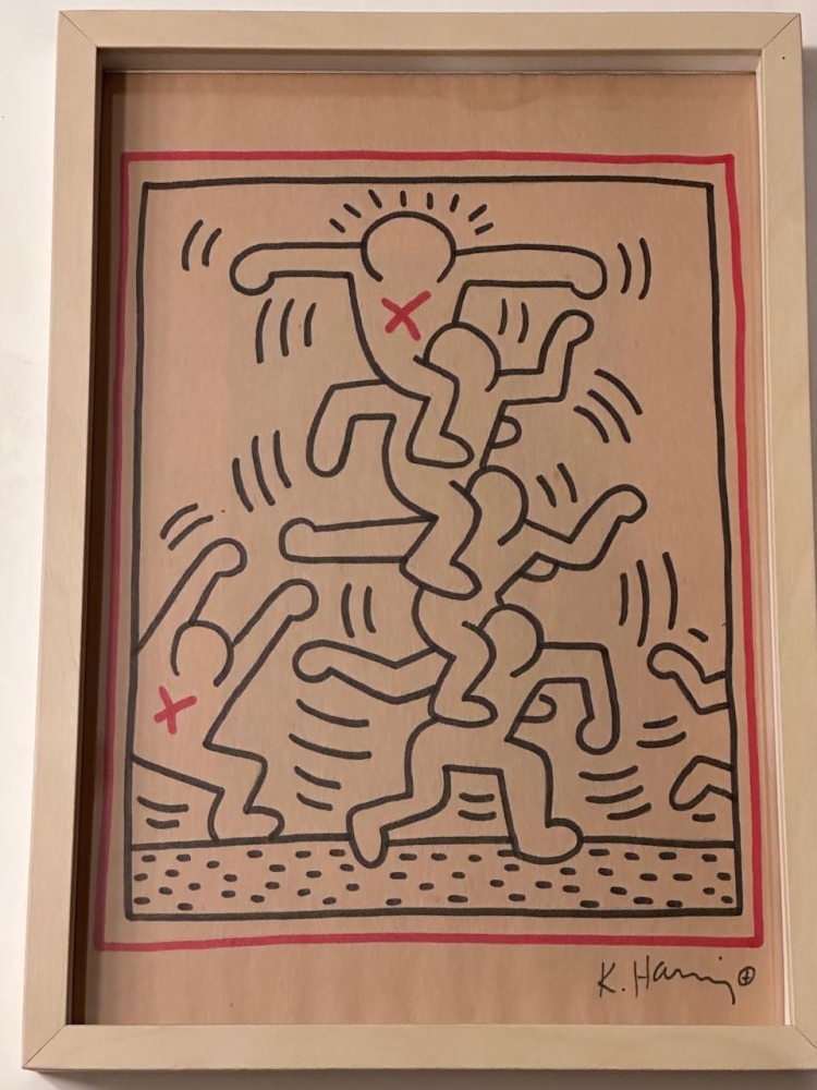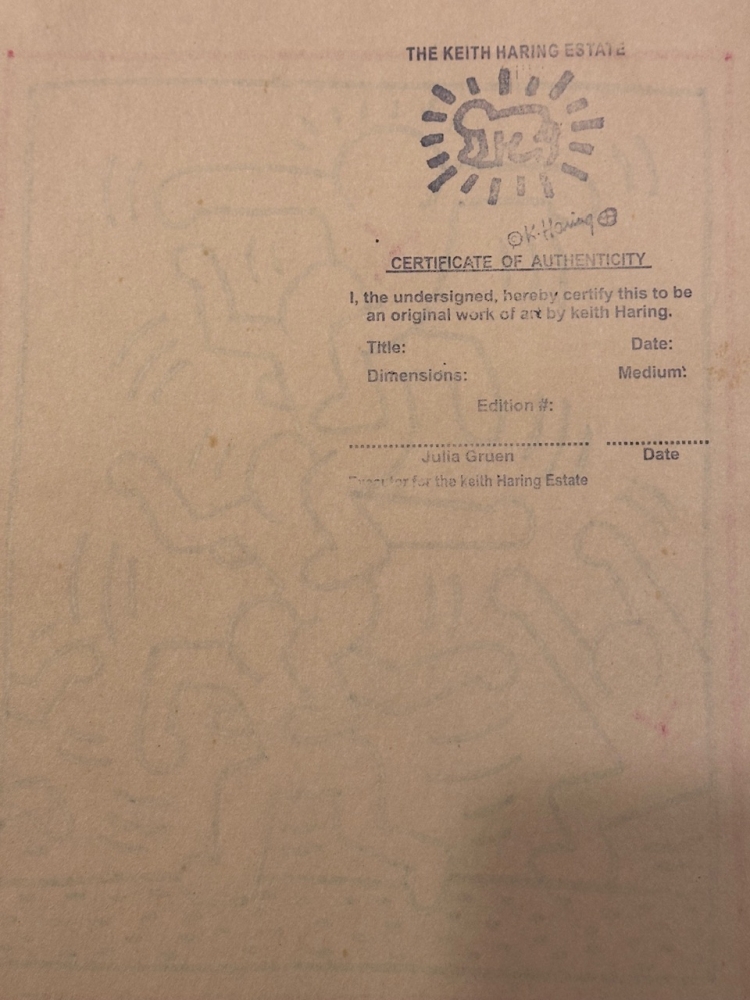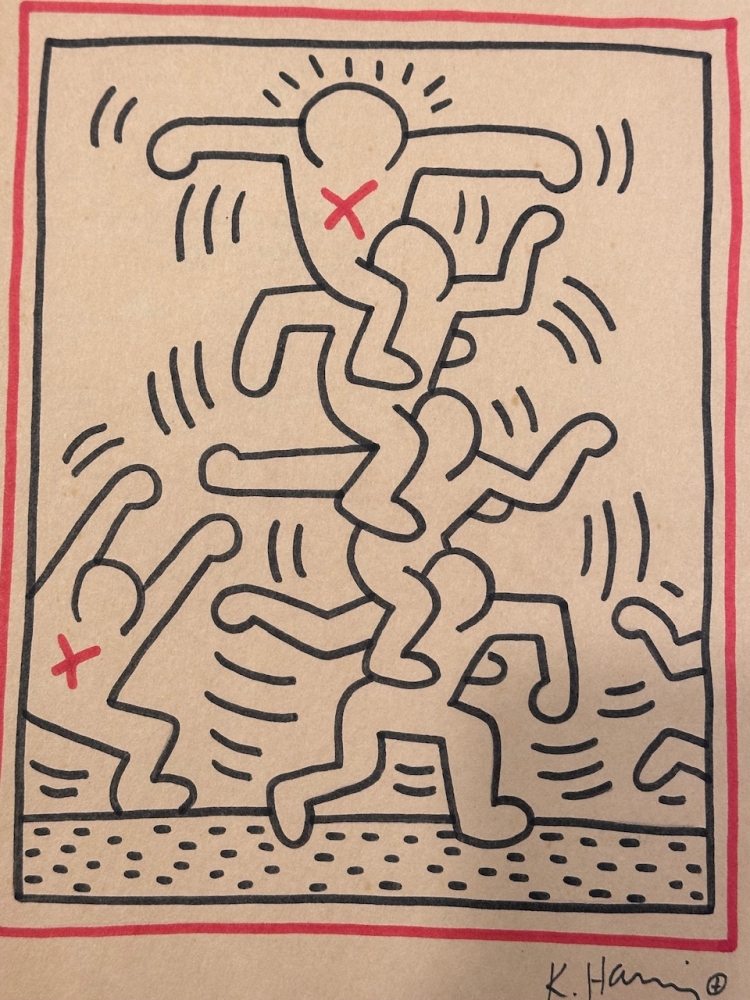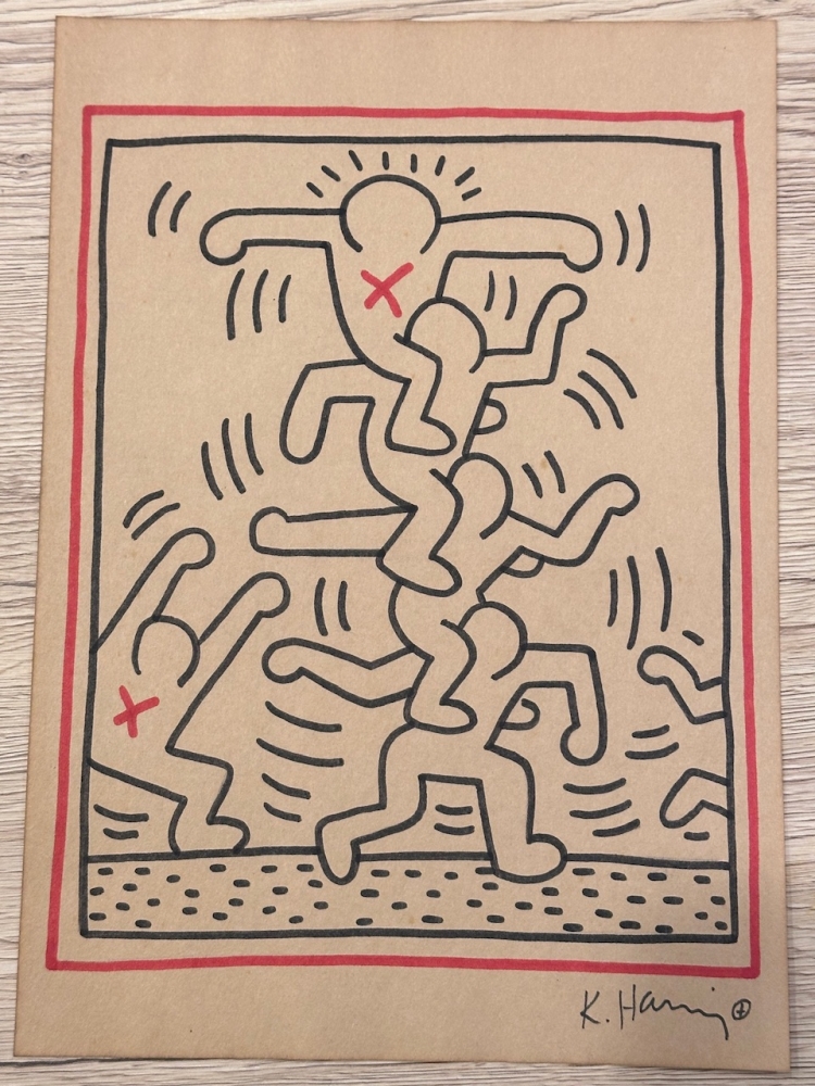 Originele tekening in stift met stempel op de keerzijde van de Keith Haring Estate Keith Haring was een Amerikaans kunstenaar. De kunst die Keith Haring maakte wordt soms popart genoemd, maar ook de termen graffiti-art en moderne kunst worden gebruikt. Zijn cartoonachtige schilderingen en tekeningen gingen onder andere over aids, drugs en apartheid