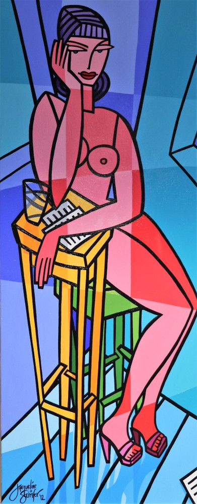 Jacqueline Schäfer woont en werkt in Amsterdam. Door het spel van duidelijke vormen, heldere kleuren en sterk gedefinieerde, zwarte contouren onderverdeeld in harmonieuze kleurvlakken is haar werk zeer herkenbaar. Het doek heeft een afmeting van 80 x 200 cm. De zijkanten van het spieraam zijn in de typerende zwart-witte vlakken geschilderd.