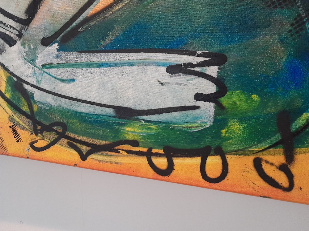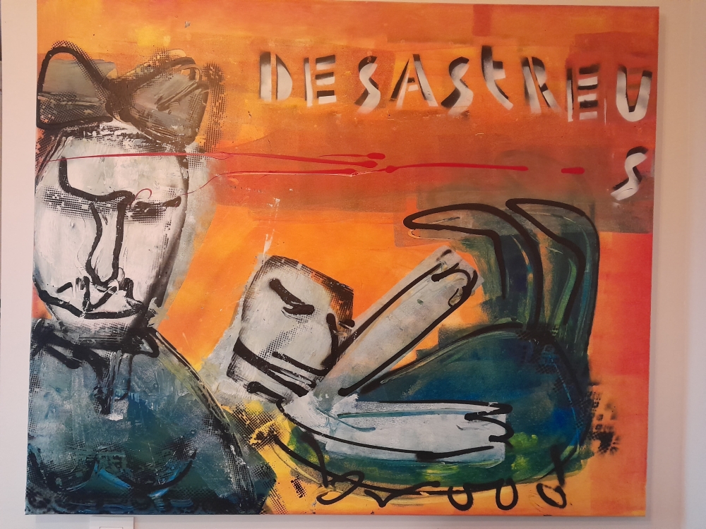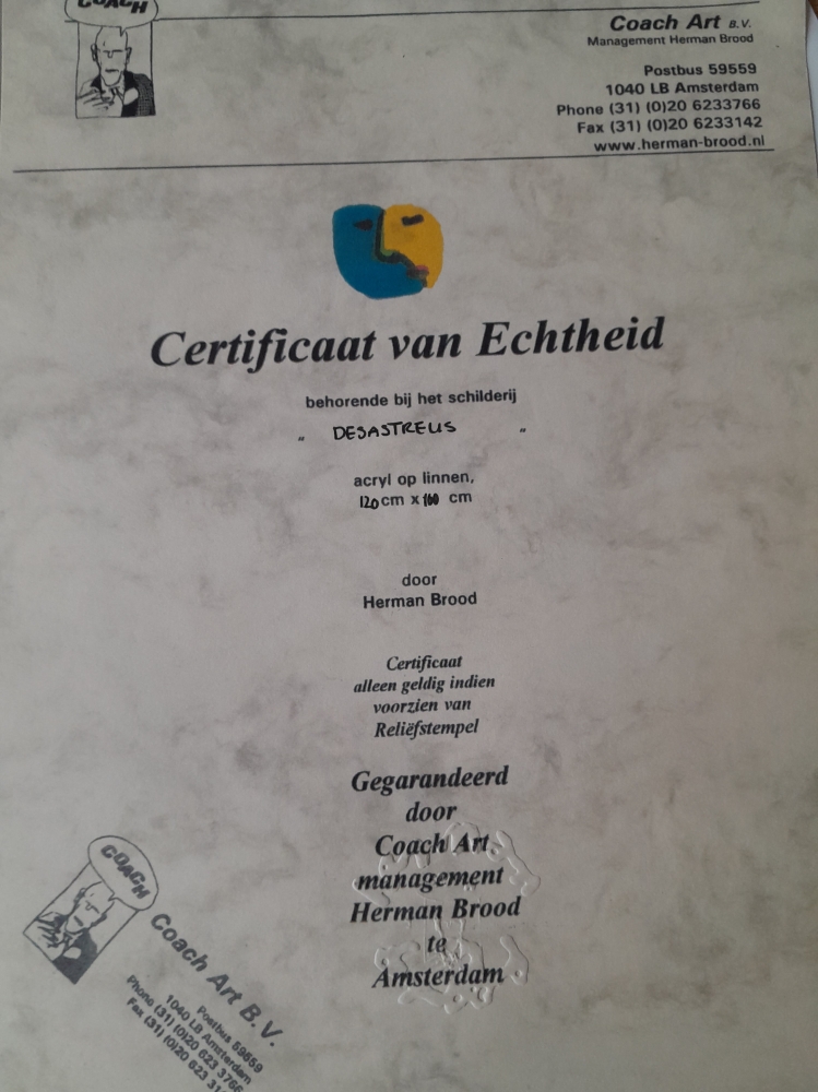 Werk Herman Brood , Desastreus. Werk van 120x100cm. Gekende stijl met sprekende kleuren. Getekend in werk Brood. Komt uit privécollectie van vriend van kunstenaar zelf. Zeer mooi werk. Dit werk is voorzien van een certificaat van het managment van Herman Brood (zie foto) coach art te Amsterdam voorzien van de noodzakelijke reliefstempel.