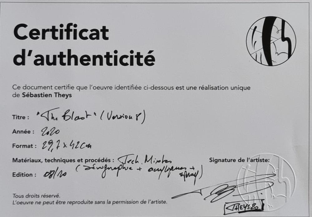 Prachtig werk van de zeer beloftevolle kunstenaar Sébastien Theys. Mixed media werk: Seriegrafie + Acryl + spray (zo is elk werk uniek) Titel: The Blast (reeks van 10 originele werken, dit is nummer 8) Art director, SÉBASTIEN THEYS is also a self-taught graffiti artist who lives in Nivelles. He paints an abstract and colorful universe inspired by urban art. Cartoon characters and black lines energetically break up his paintings and give a dynamic aspect to his work. The colors that regularly appear in his artworks are mainly pink, yellow and blue. Each artwork is the result of an improvisation which allows him to express himself through paint splashes and characters directly coming from his childhood. His abstract work offers the freedom of interpretation but also the possibility to lose oneself in the many colors used. He likes to think that his artworks are a journey inside himself, where the black line represents a timeline leaving many souvenirs behind.