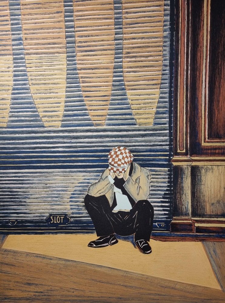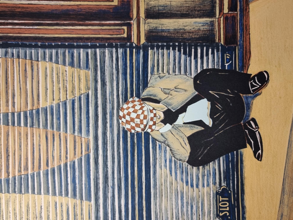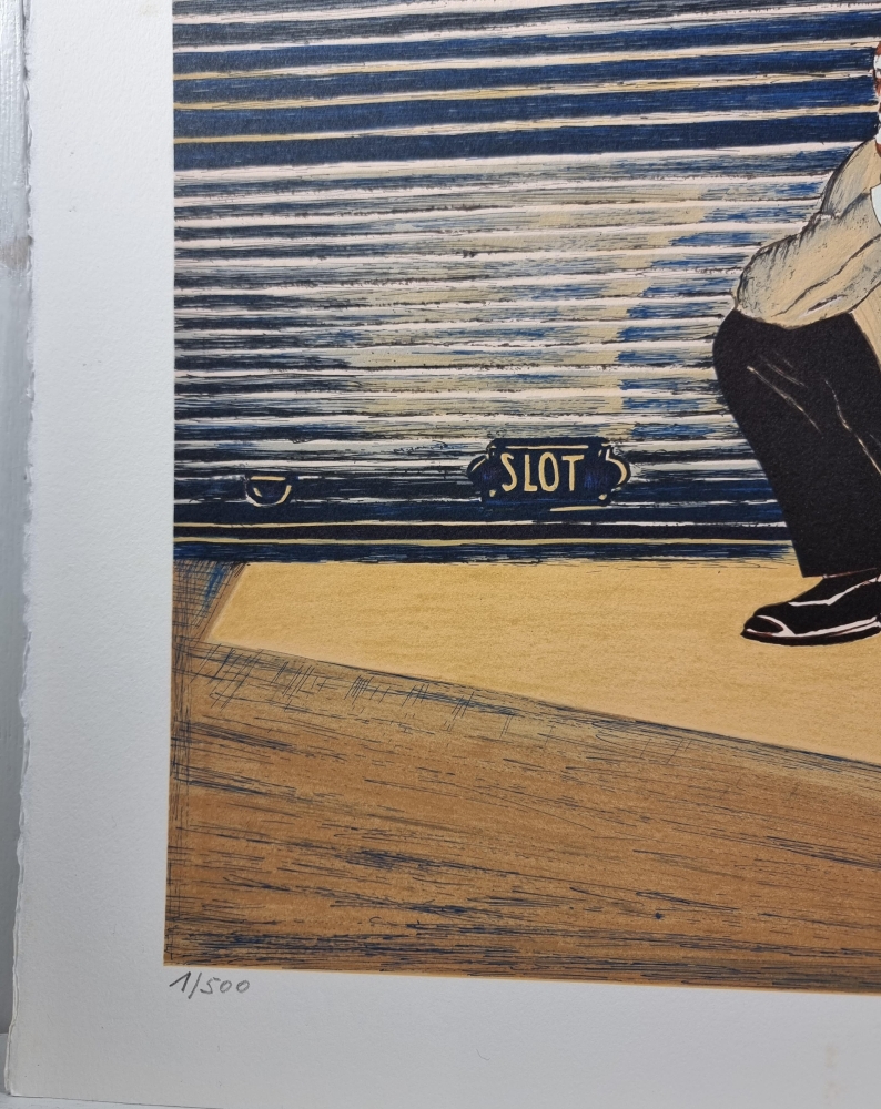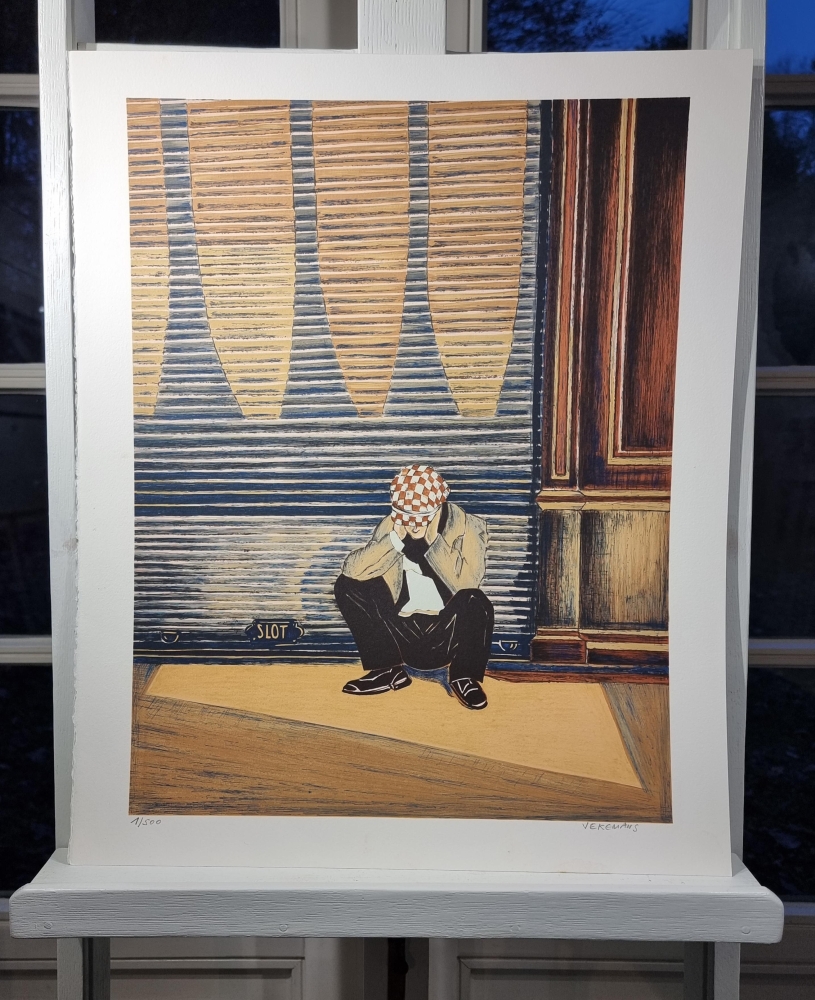 Kleurenlithoigrafie van Bruno Vekemans, getiteld "Clochard". Gesigneerd en genummerd door de kunstenaar in potlood onderaan. Editie op 500 exemplaren, dit is het nummer "1"! Het werk is in perfecte staat.