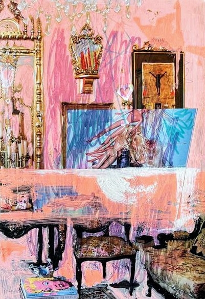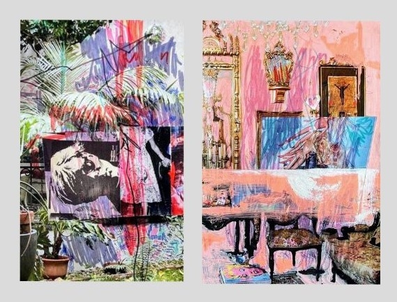 2 stuks: 25 cm x 31 cm en 23 cm x 34 cm - Collage en viltstift op papier - Jorden is opgeleid als schilder maar werkt projectmatig. Hoewel zijn werk visueel kan verschillen afhankelijk van tijd, ruimte en context is er coherentie door de constante verwijzing naar de idee van het paradijs. Witte stranden, palmbomen en een mooie ondergaande zon: het zijn (cliché)beelden die een sfeer van blijdschap, geluk en perfectie oproepen. Jorden is gefascineerd door de manier waarop deze beeldcultuur in onze maatschappij gebruikt wordt. Kitsch, decadentie of bedrog zijn nooit ver weg. Zijn werk zit vol tegenstellingen: idyllische droombeelden met een melancholische connotatie. De contradictie zit ook letterlijk in zijn extreem kleurgebruik, een gevolg van zijn eigen kleurenblindheid.