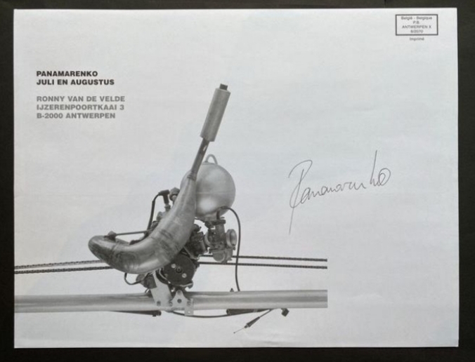 Originele envelop van Panamerenko van ,1 van de vele tentoonstellingen,bij kunsthandelaar Ronny van de Velde te Antwerpen. Origineel handgesigneerd door de kunstenaar hemzelf. Vermoedelijk voor het versturen van de uitnodiging.