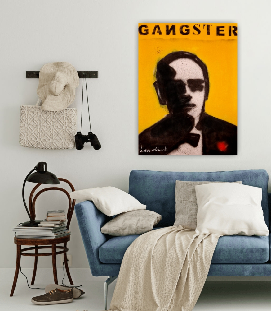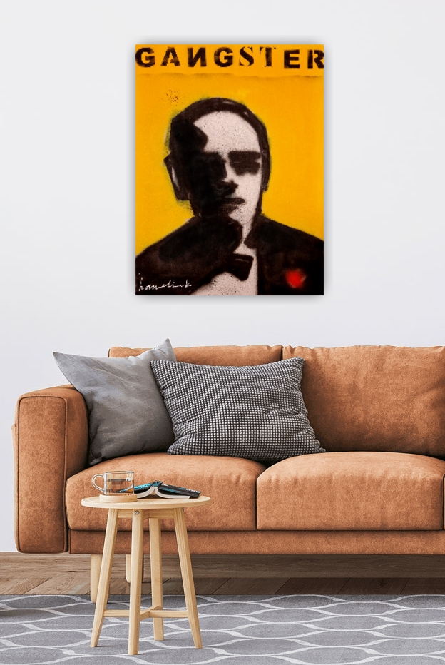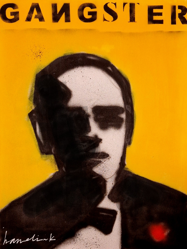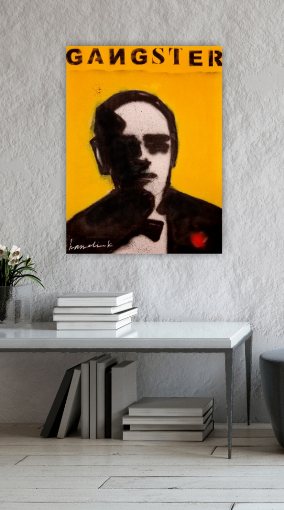 Orgineel schilderij van de Nedrelandse kunstenaar Bart Hamelink ( google ) . Een afbeelding van een gangster. Het werk is gemaakt met acryl verf en graffiti. Boven het schilderij zijn de letters gespoten : gangster . Het werk is geeinspireerd door de film The Godfather. Het werk is in perfecte staat en wordt geleverd met een certificaat van Hamelink.