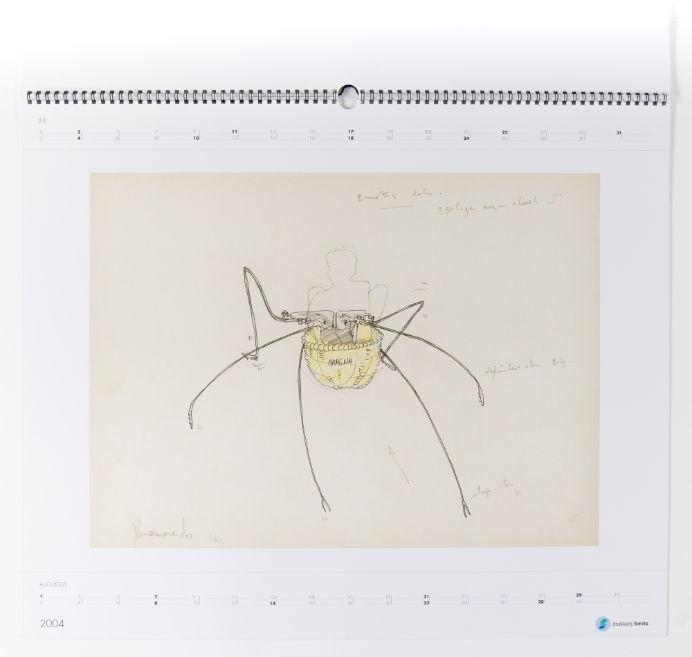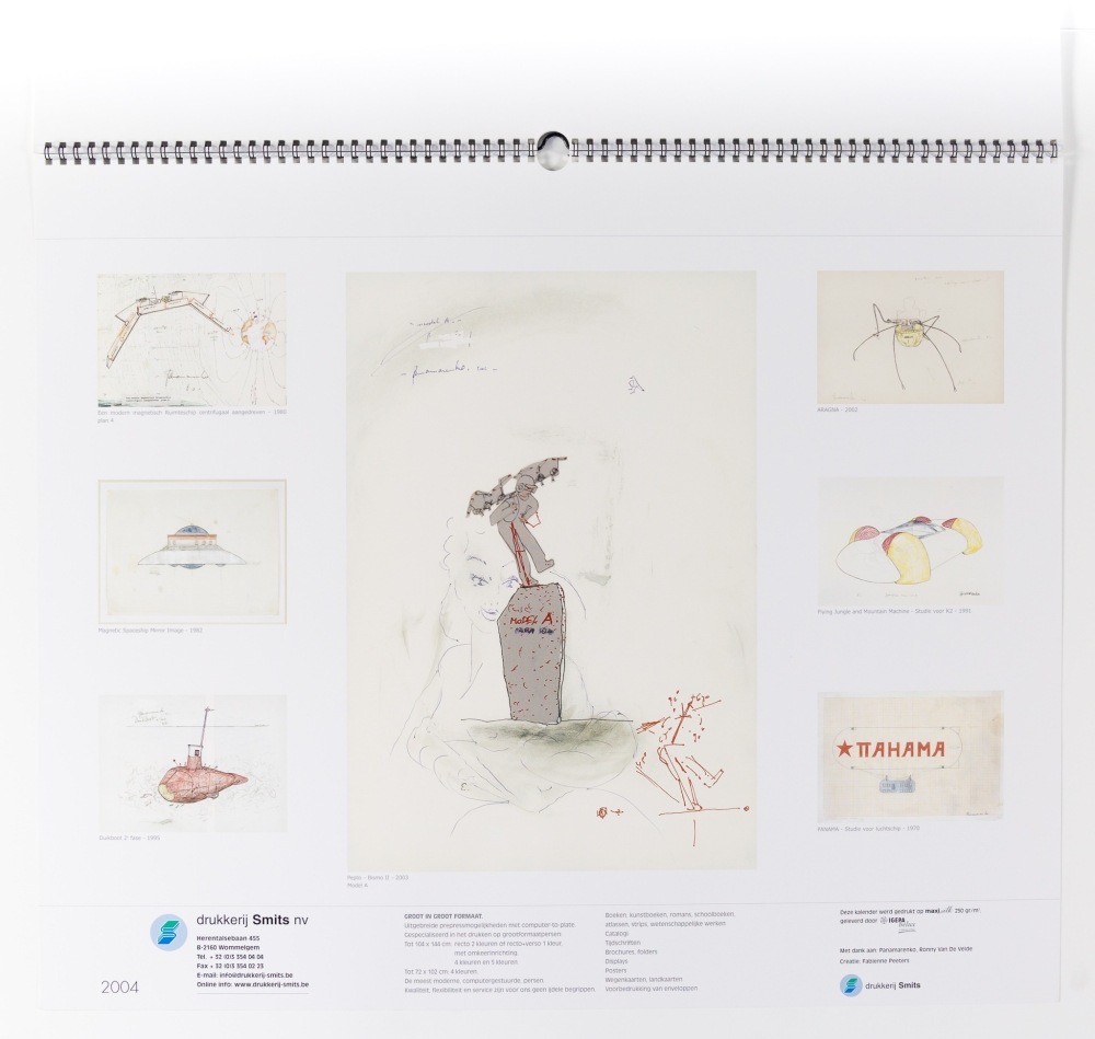 A calendar for 2004, which came about after a collaboration between Panamarenko and Ronny Van de Velde, made by Fabienne Peeters, printed by Drukkerij Smits on 250gt / m² paper.