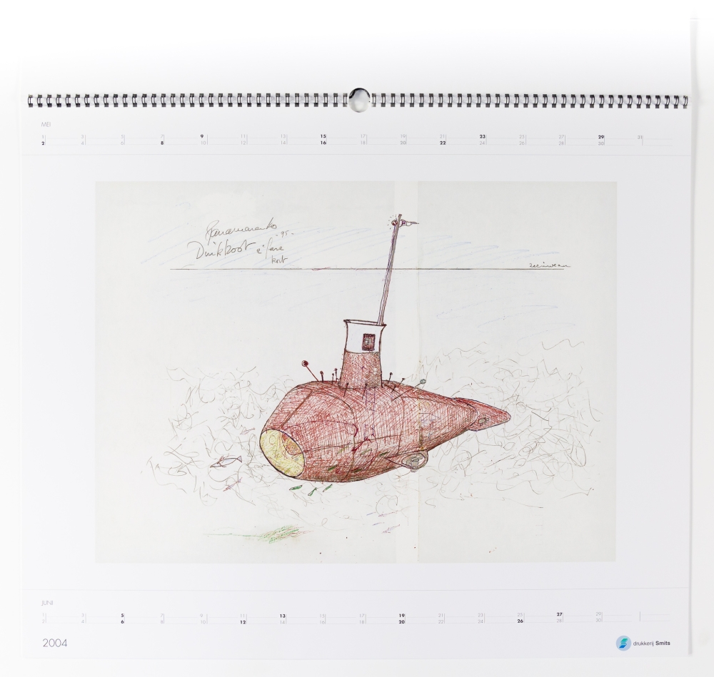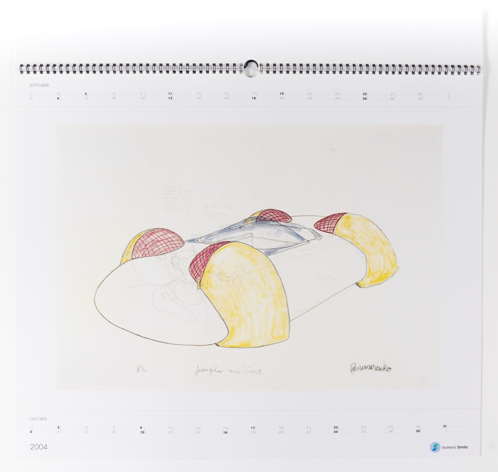 The calendar contains 6 drawings of Panamarenko: Modern magnetic spaceship, Submarine 2nd phase, Pepto Bismo II, Aragna, Flying Jungle, and Mountain Machine and Panama in a high-quality print.