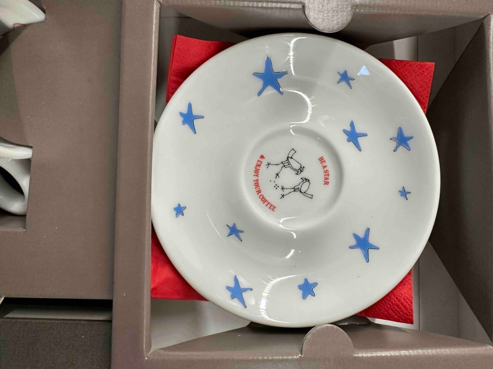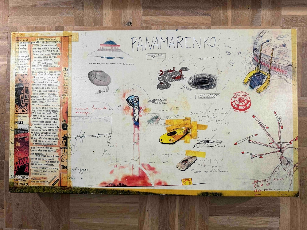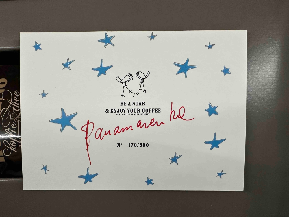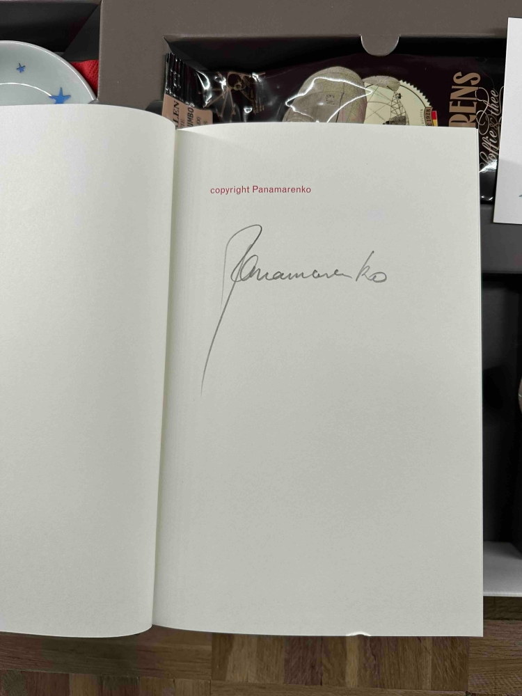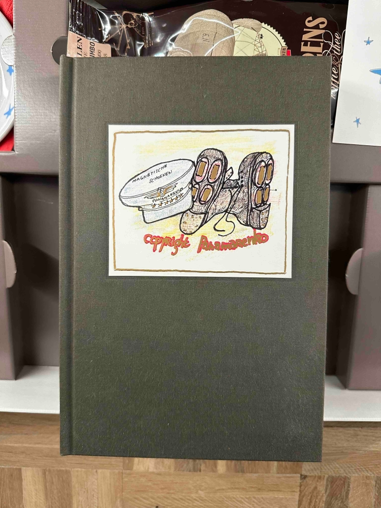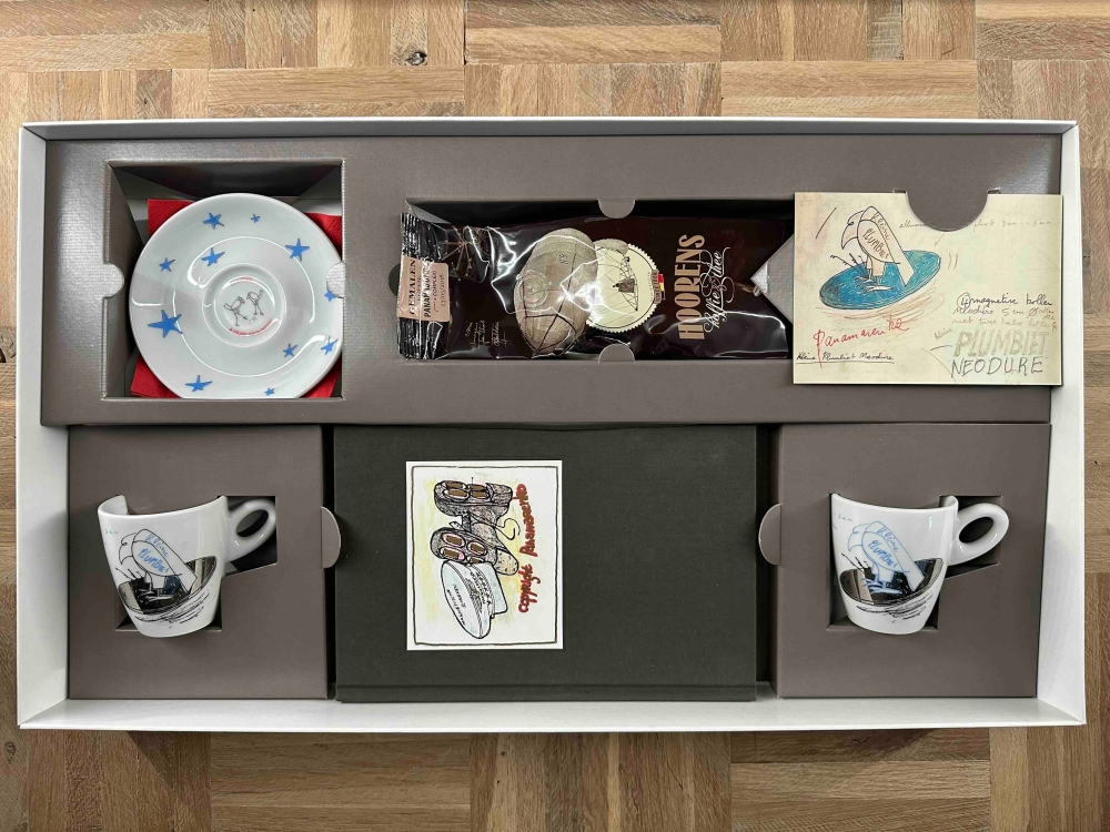 Mooie luxebox van Panamarenko, uitgegeven door Hoorens Koffie. Enkele jaren geleden uitgegeven in beperkte oplage van 500 stuks. Deze box bevat bovendien een handgesigneerd boek van Panamarenko 'Copyright'. Mooie doos boordevol tekeningen van Panamarenko. Inhoud: * twee koffiekopjes , thema Kleine Plumbiet van Panamarenko. Deze hebben signatuur binnen in tas en nummering onderaan. Inclusief onderbordjes * handgesigneerd boek van Panamarenko * pakje Panajumbo koffie * prachtige kaart 'Kleine Plumbiet' getekend in de plaat met nummering Exclusief collectorsitem.