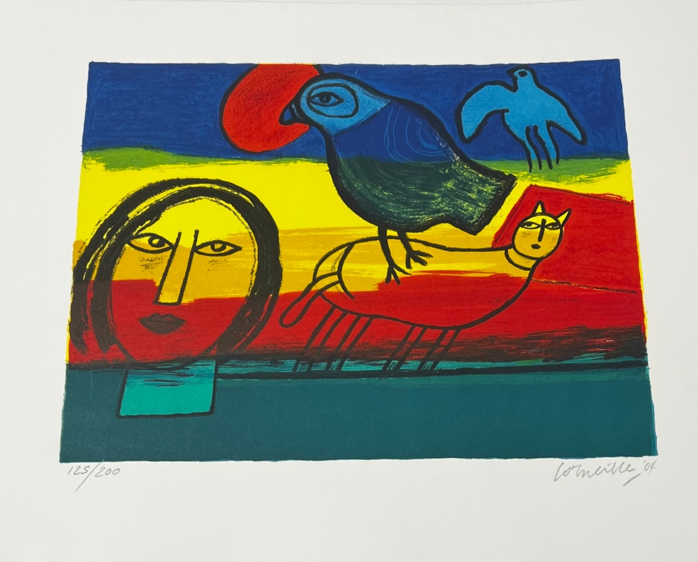 A great master of color, in the wake of Gauguin and Matisse, Guillaume Corneille created in 2004 a work associating the cat, the birds, the Muse woman, and the glowing sun. The quality of the lithographic plates is such that it gives the impression of being faced with the brushstrokes of the painter. Rêveries d'été brings joy and dreams to a living room, kitchen or bedroom. The frame of the last image is a presentation suggestion, it is not included in the advertisement. Original lithograph by painter Guillaume Corneille (1922-2010), founding member of the Cobra movement. Signed and dated in pencil by the artist Total dimensions: 40 x 52 cm - 2004 - Numbered 125/200 - Atelier Corneille stamp on the back Image in perfect condition - Lower left corner slightly bent - Secure shipping with UPS Identified as an important figure in the renewal of abstraction in Northern Europe, Corneille gradually moved from 1967 towards a rich and colorful New Figuration that coordinated with the Pop Art taste of the 1960s and 1970s.