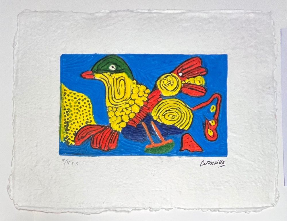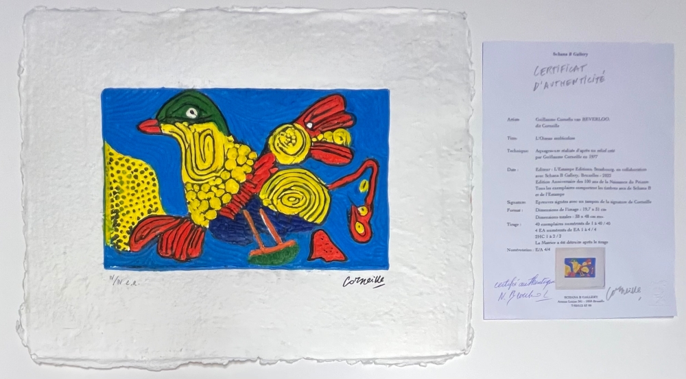 38 x 48 cm - copy EA 4/4 - trade edition of 40 copies. Aquagravure based on a relief created by Guillaume Corneille in 1977. Anniversary edition to mark the 100th anniversary of the painter's birth, produced by one of the painter's historic galleries, L'Estampe. Stamp signature. Aquagravure is a relief engraving, a complex craft technique involving on-site production of parchment paper in large vessels.