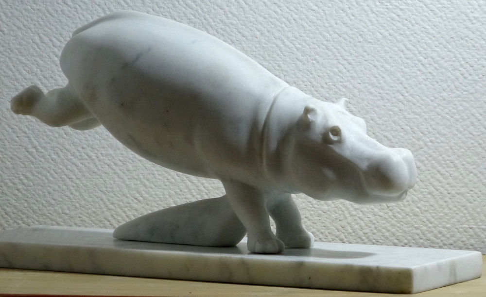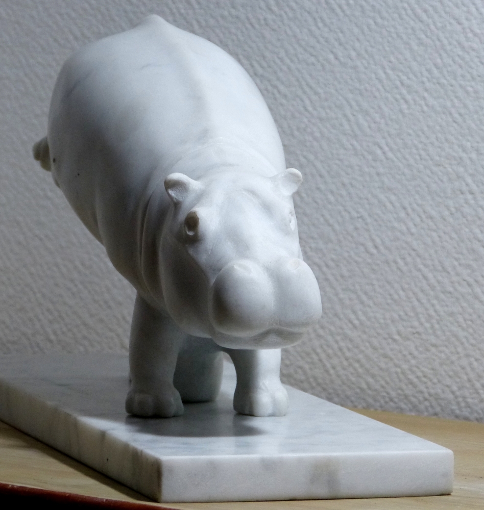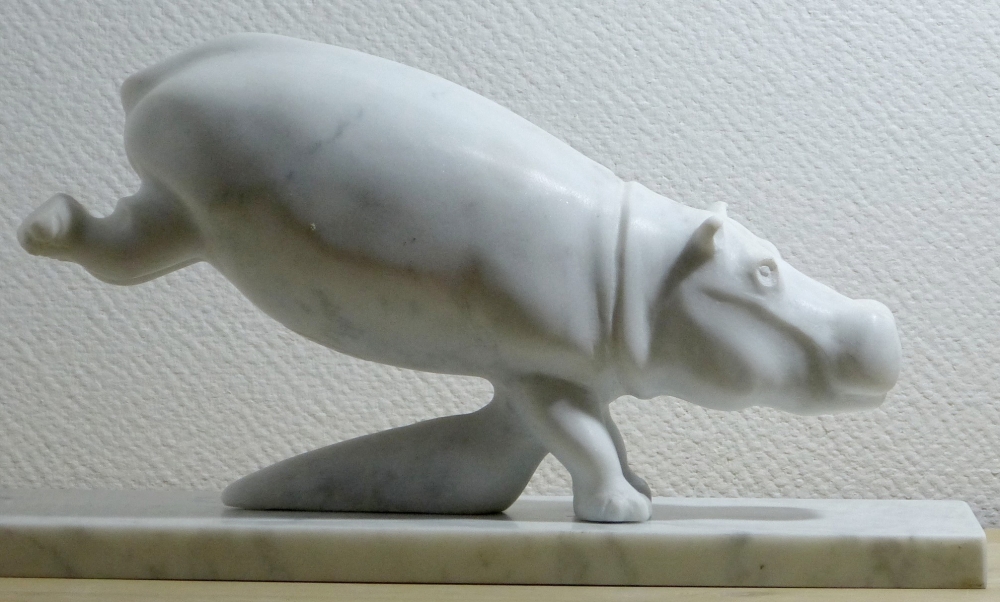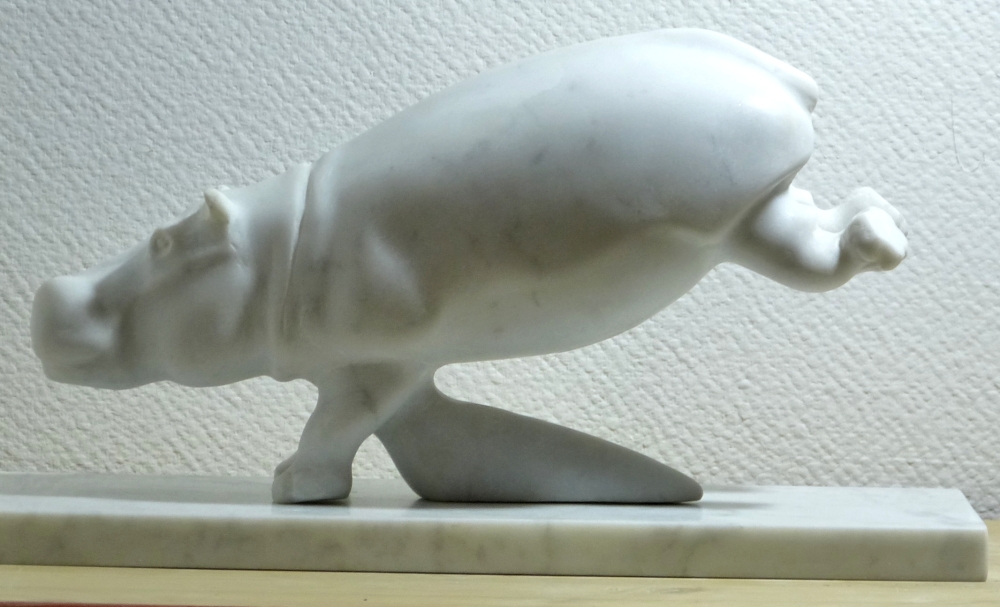 Statuette sculptée, par taille directe, dans un bloc de Marbre Bianco MichelAngelo de Carrare (Italie) Sculptée manuellement dans mon atelier à Mougins. Pièce unique neuve. Dimensions H:17 L:30 P:9 cm. Signature gravée sur le ventre de l'animal. Socle amovible en marbre de Carrare (35/12/2 cm) Certificat d'authenticité signé par l'artiste.